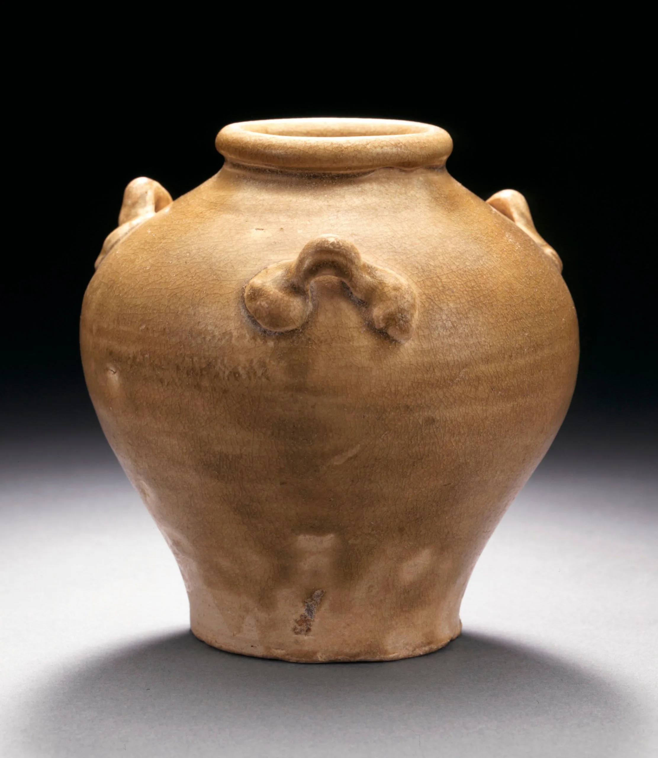 - Wheel-thrown stoneware with cream slip, underglaze brown painted decoration, and clear glaze