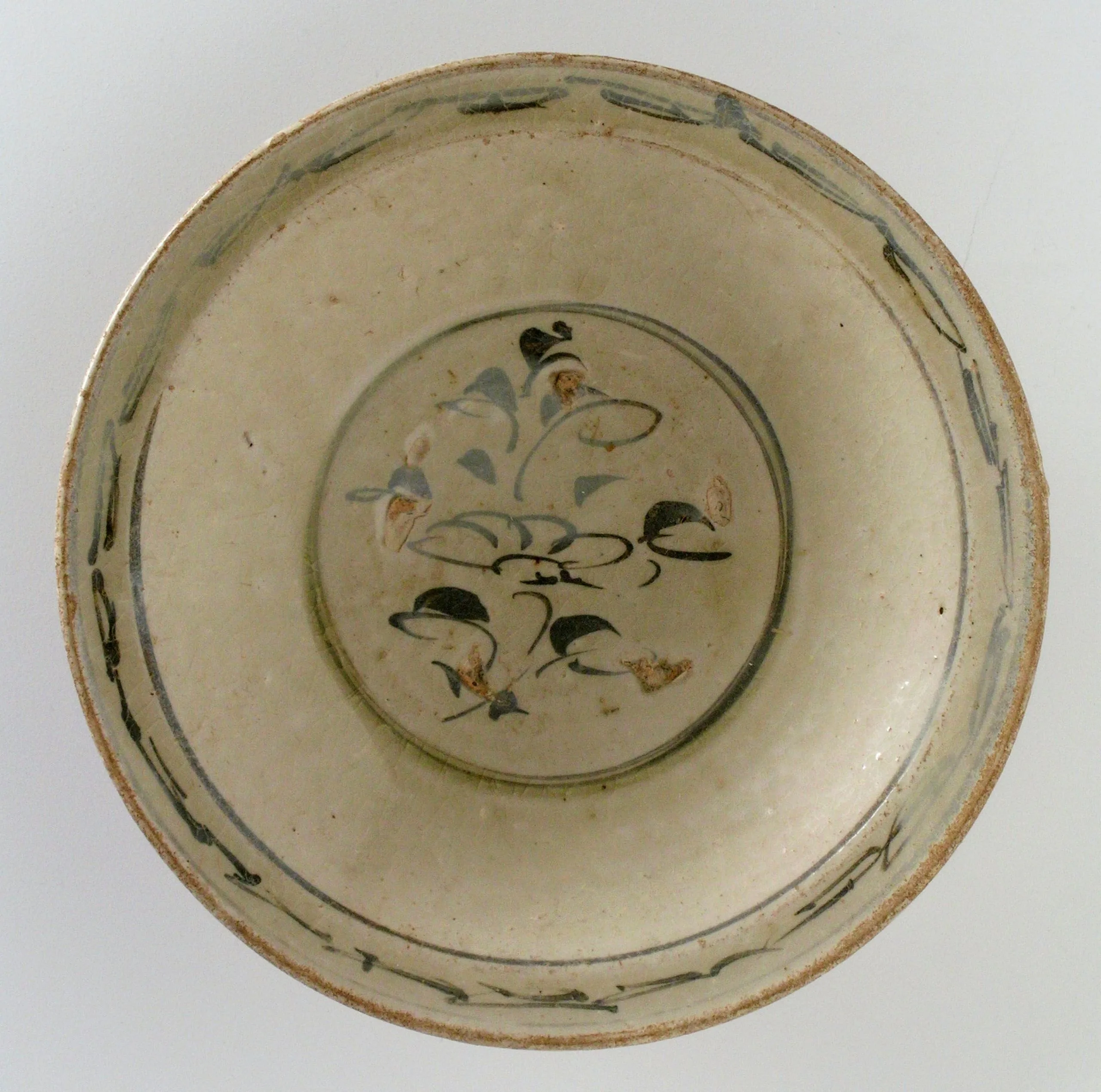 - Wheel-thrown stoneware with cream slip, underglaze brown painted decoration, and clear glaze