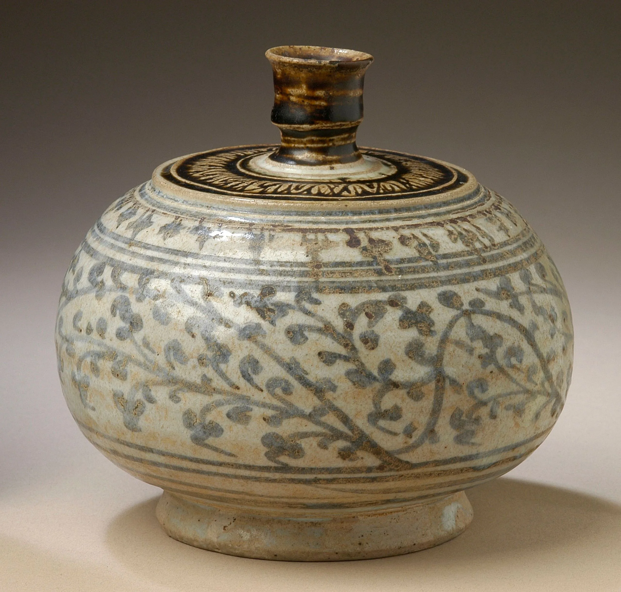 - Stoneware with underglaze brown painted decoration and partial brown glaze