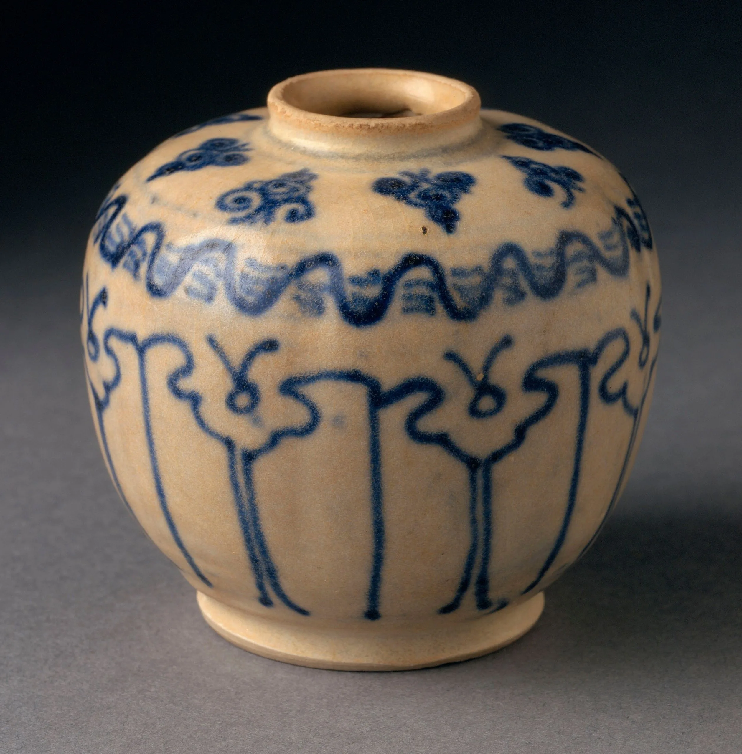 - Wheel-thrown stoneware with cream slip, underglaze blue painted decoration, and clear glaze