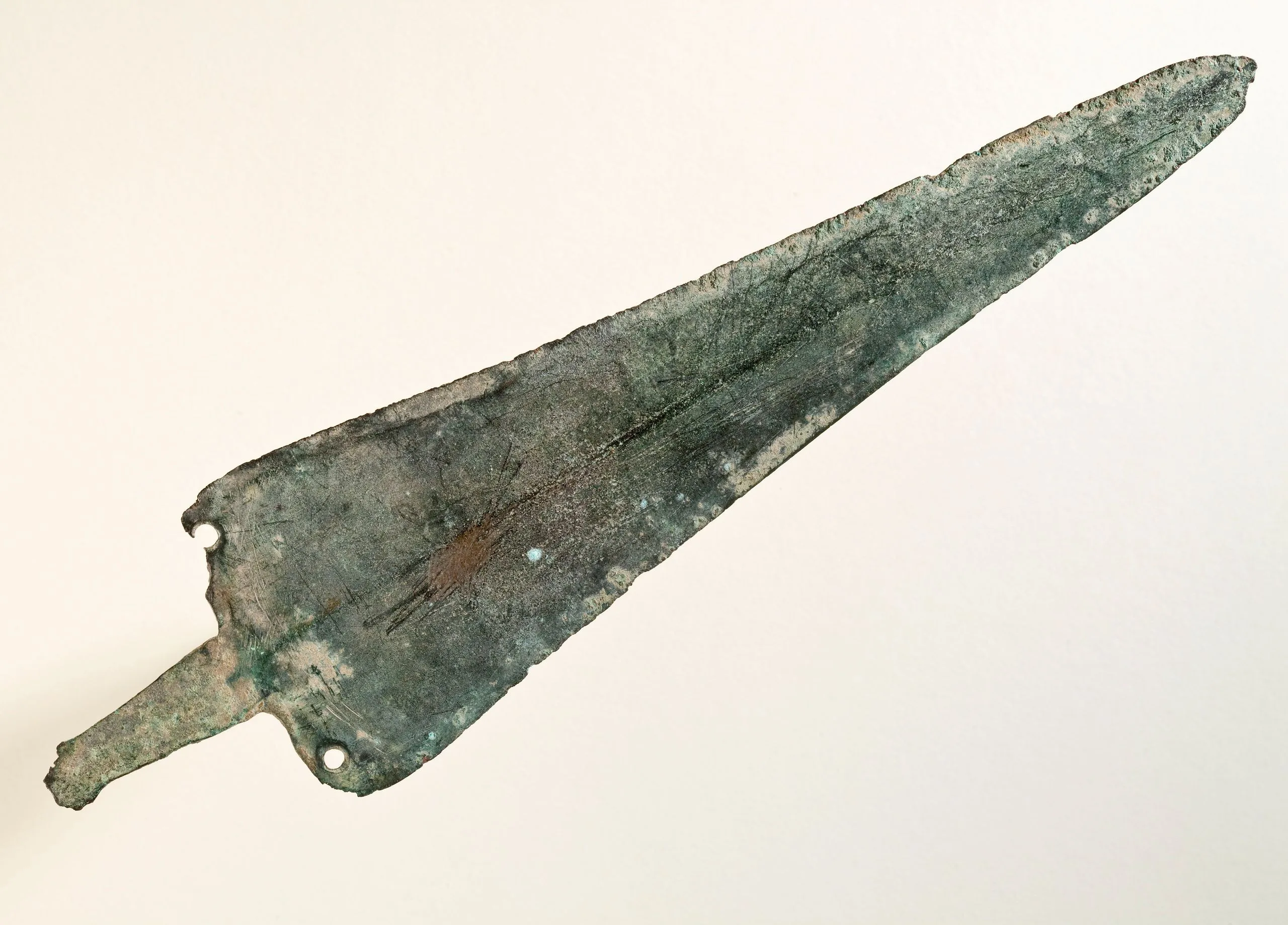 Ancient bronze blade with heavy green and gray patina, leaf-shaped with a short tang pierced by two rivet holes, displayed diagonally against a pale background
