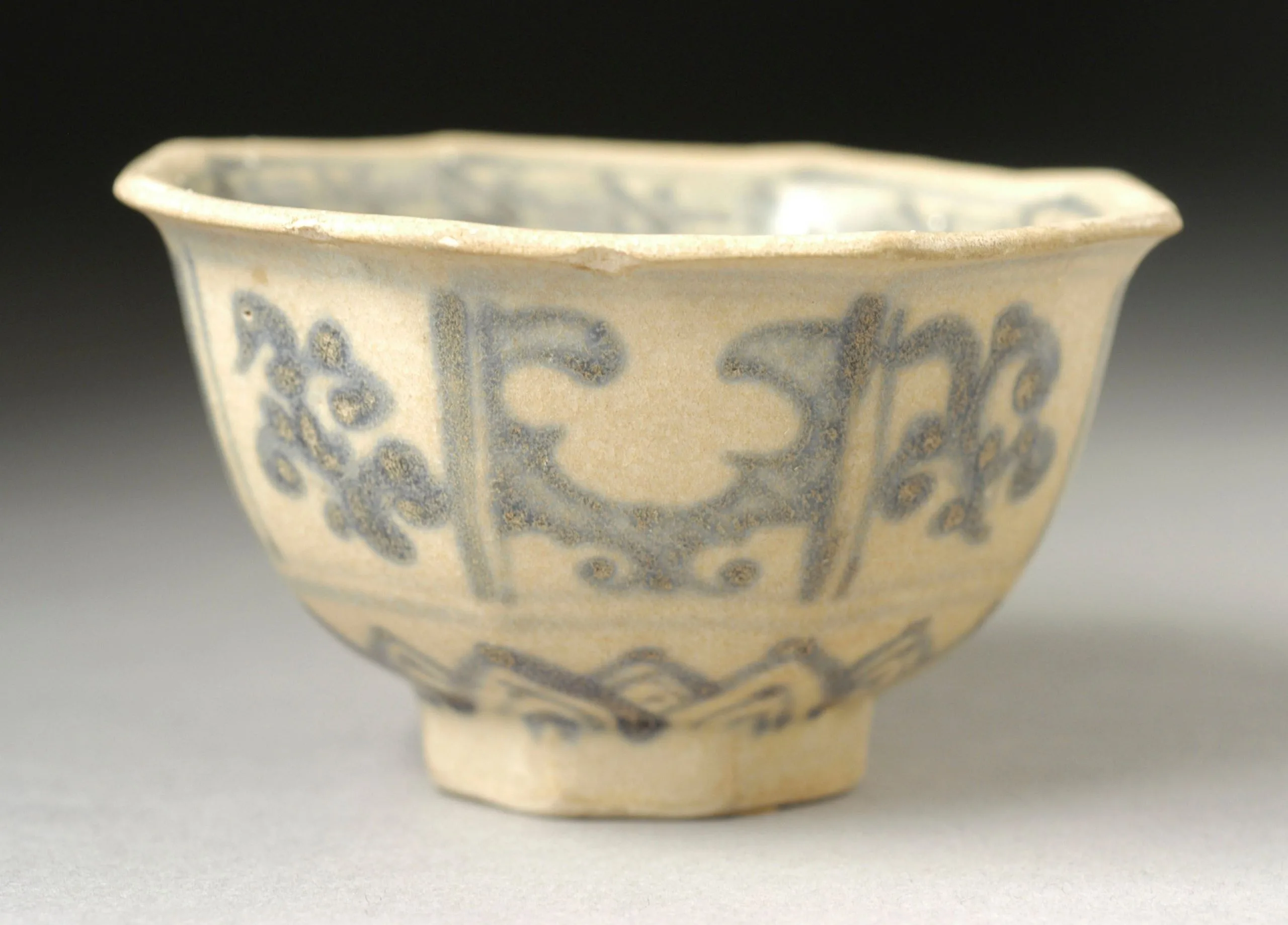 - Stoneware with cream slip, underglaze blue painted decoration, and clear glaze
