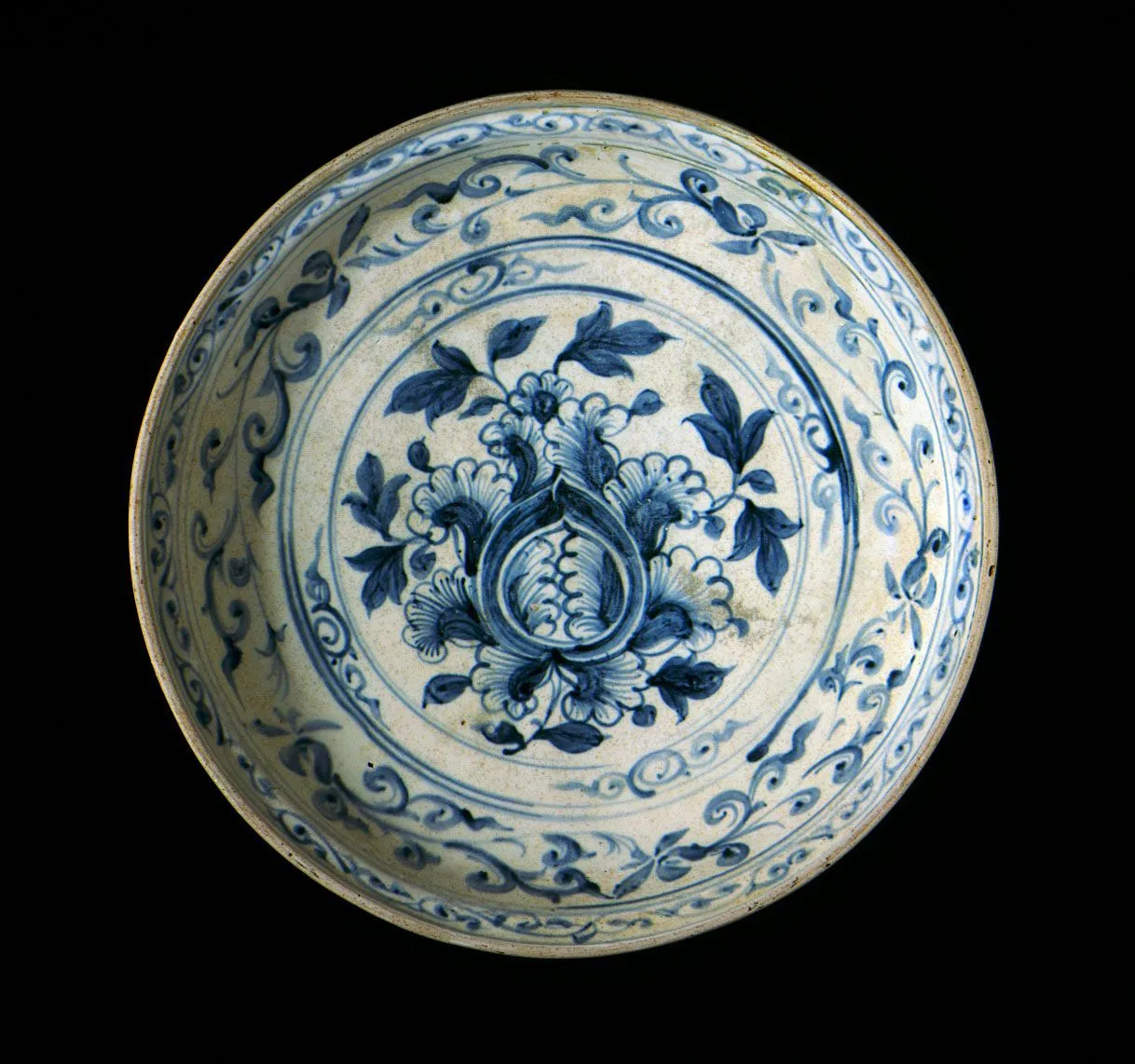 - Wheel-thrown stoneware with cream slip, underglaze blue painted decoration, and clear glaze