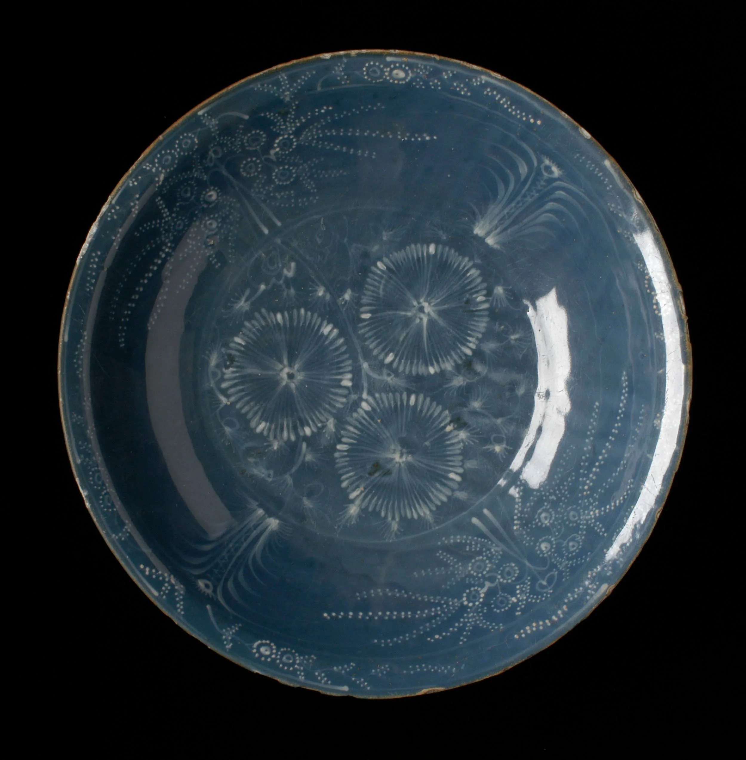 - Porcelain with raised white slip decorations and translucent blue glaze