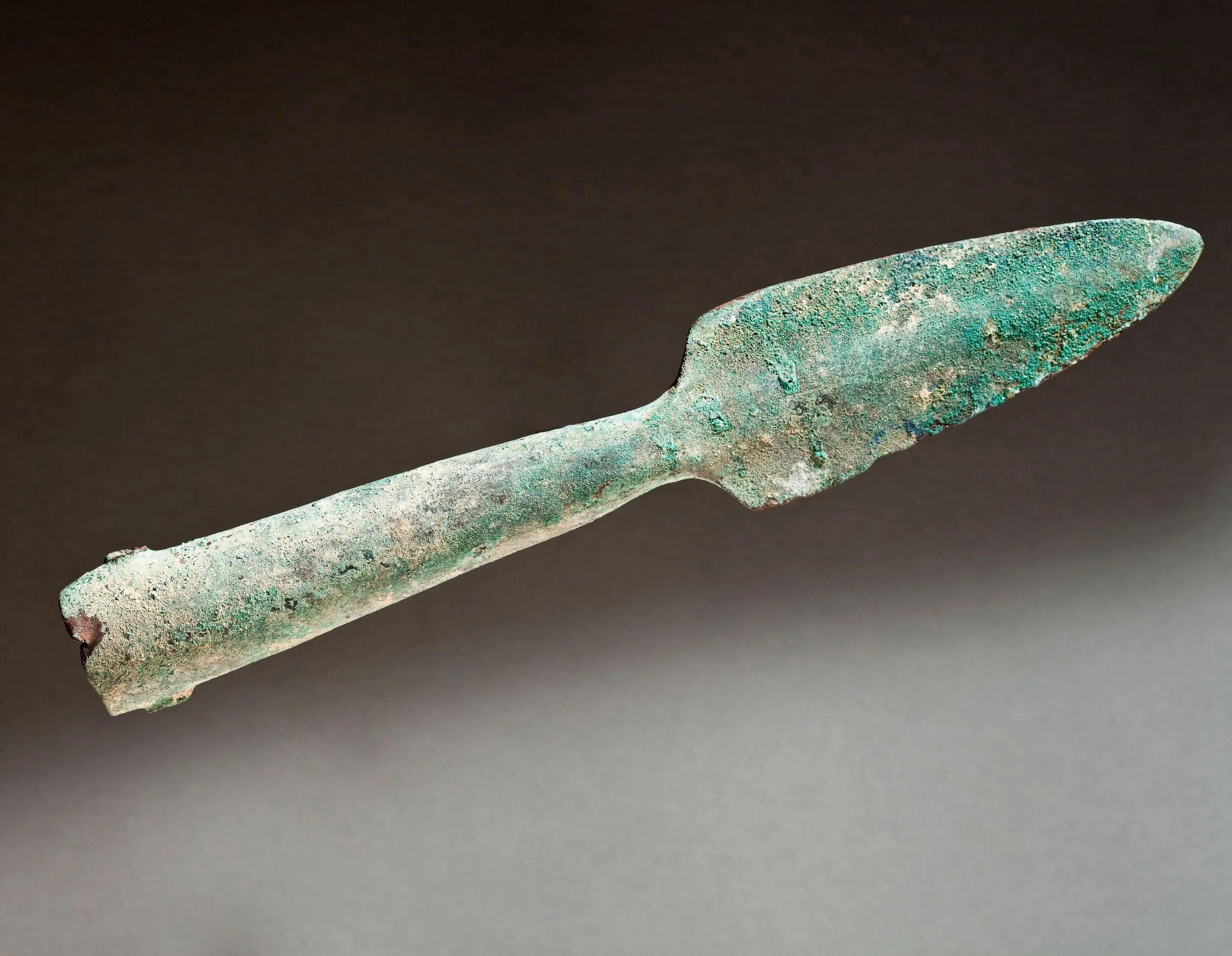 Bronze spearhead or blade with heavy turquoise and gray-green patina, leaf-shaped tip widening from a long narrow tang, heavily corroded surface