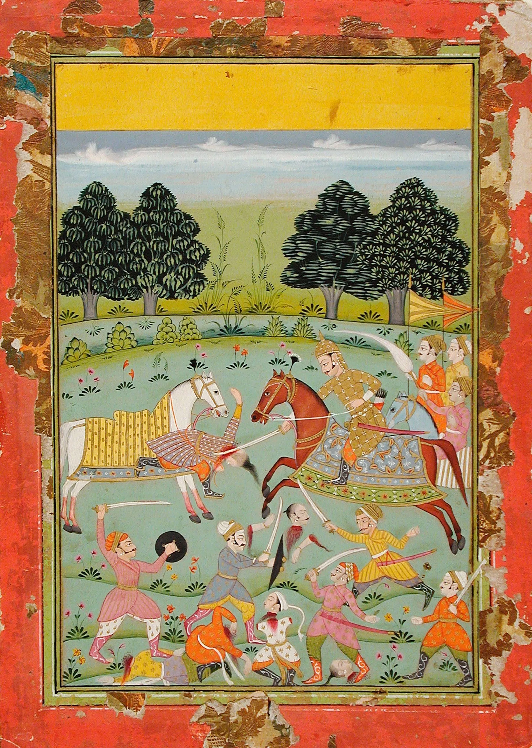 Here, a male Rajput warrior on a chestnut stallion is in the act of decapitating his mounted opponent with a sword. He wears a suit of chain mail armor and a helmet with an aventail or hood of chain mail. Behind him, attendants hold standards and an honorific fly whisk made of the white tail-hairs of a yak (cauri or chowri). In the foreground, foot soldiers attack each other with several being decapitated and delimbed. The battle takes place in a forest glen on a partly cloudy day. The blind header would have been reserved for the poetic description of the melody. There are remnants of an overlaid marbled paper border over the outer red border and inner margins.