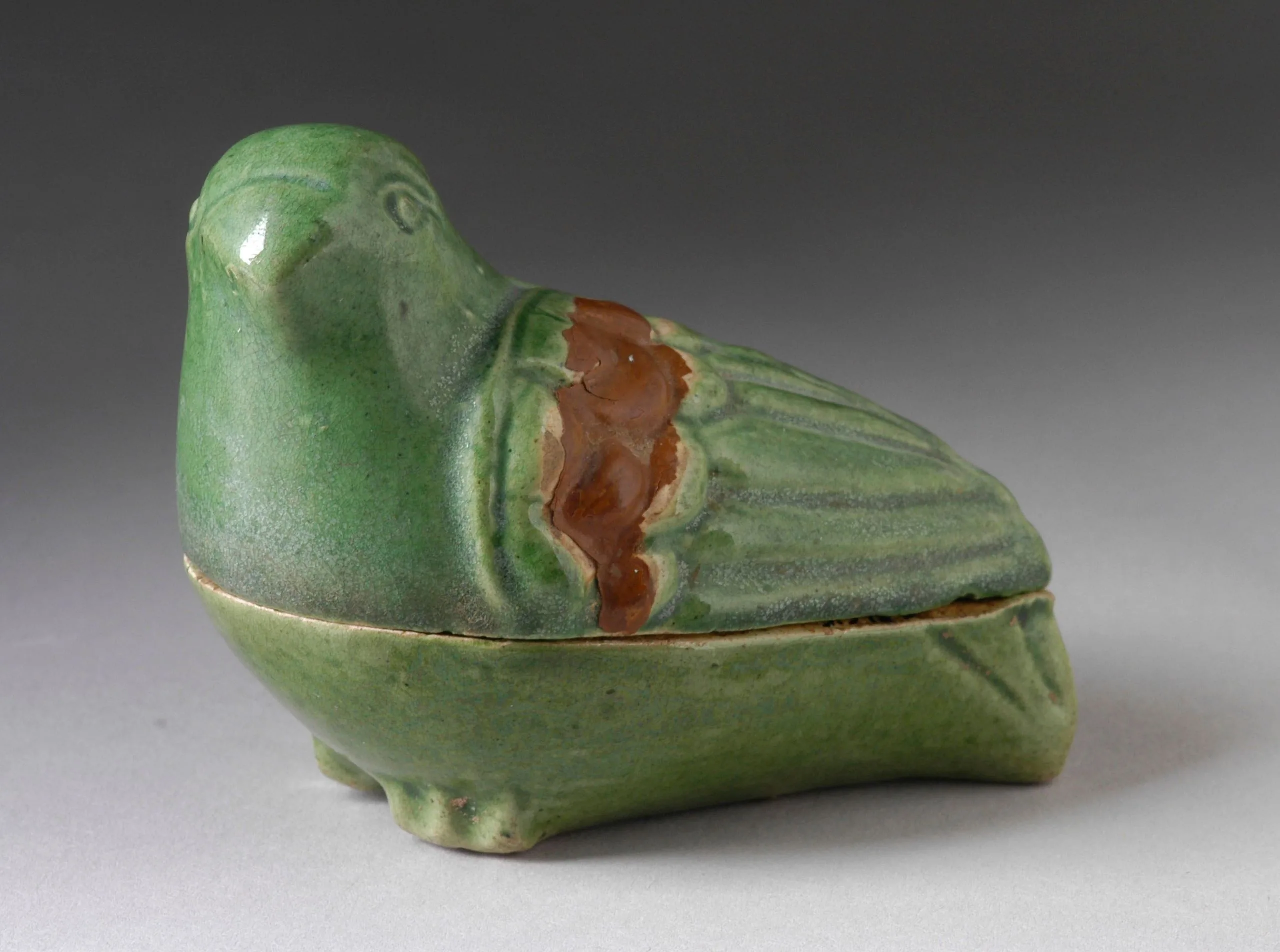 - Stoneware with dark green glaze and brown markings
