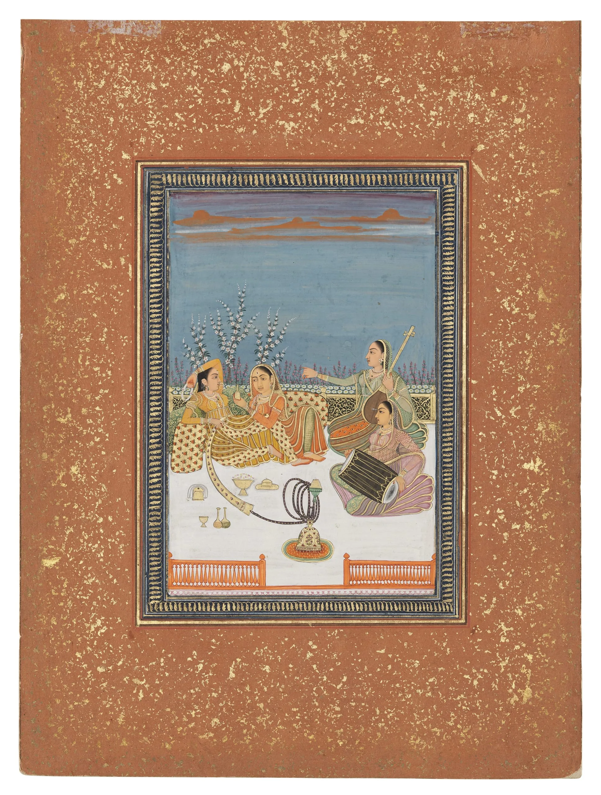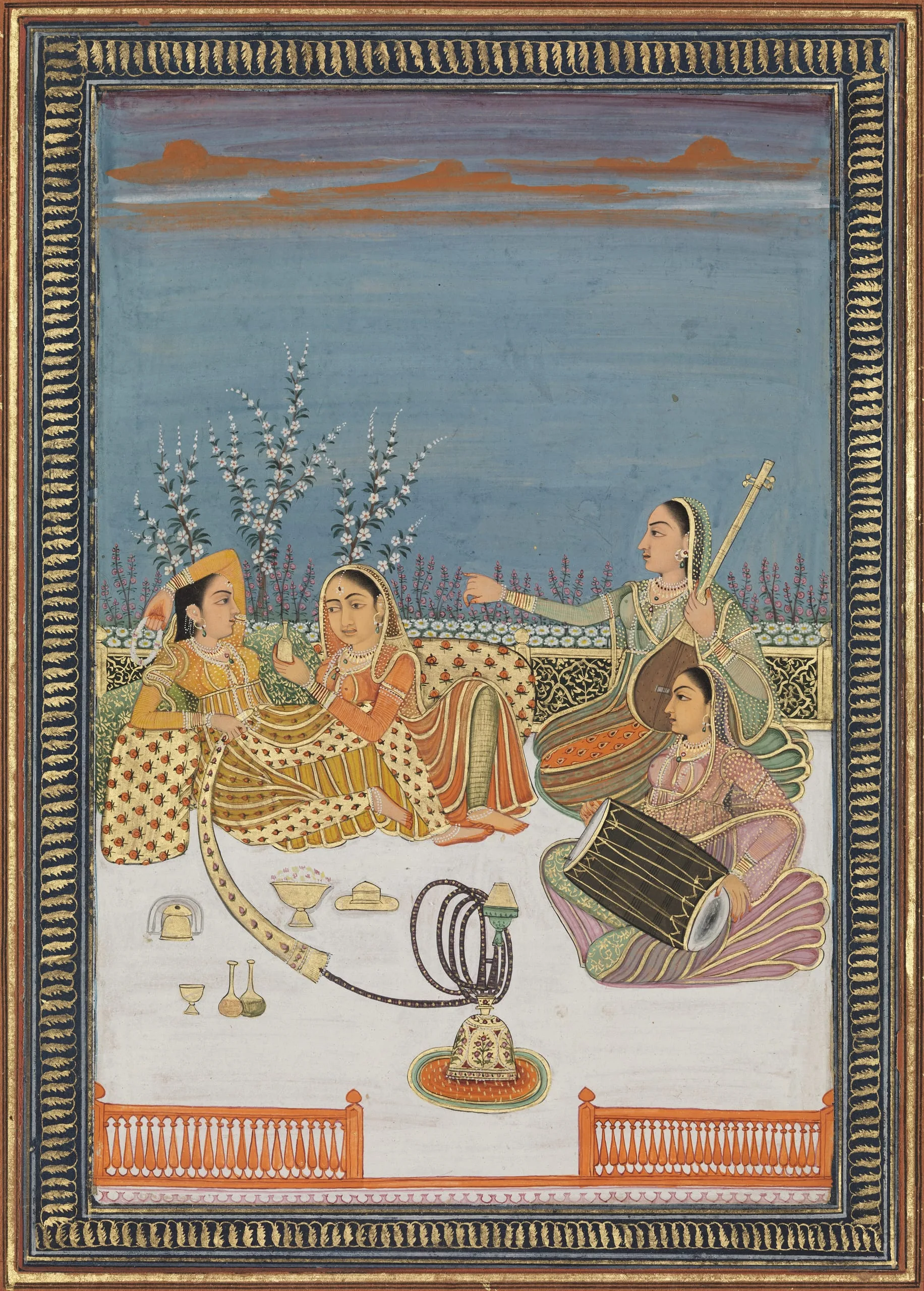 A princess reclines against floralized bolsters while listening to two musicians at sunset. She holds a floral garland and is smoking an enameled hookah with a silk velvet cover for the “snake” (inhalation tube). A maidservant offers her perfume from a bottle.