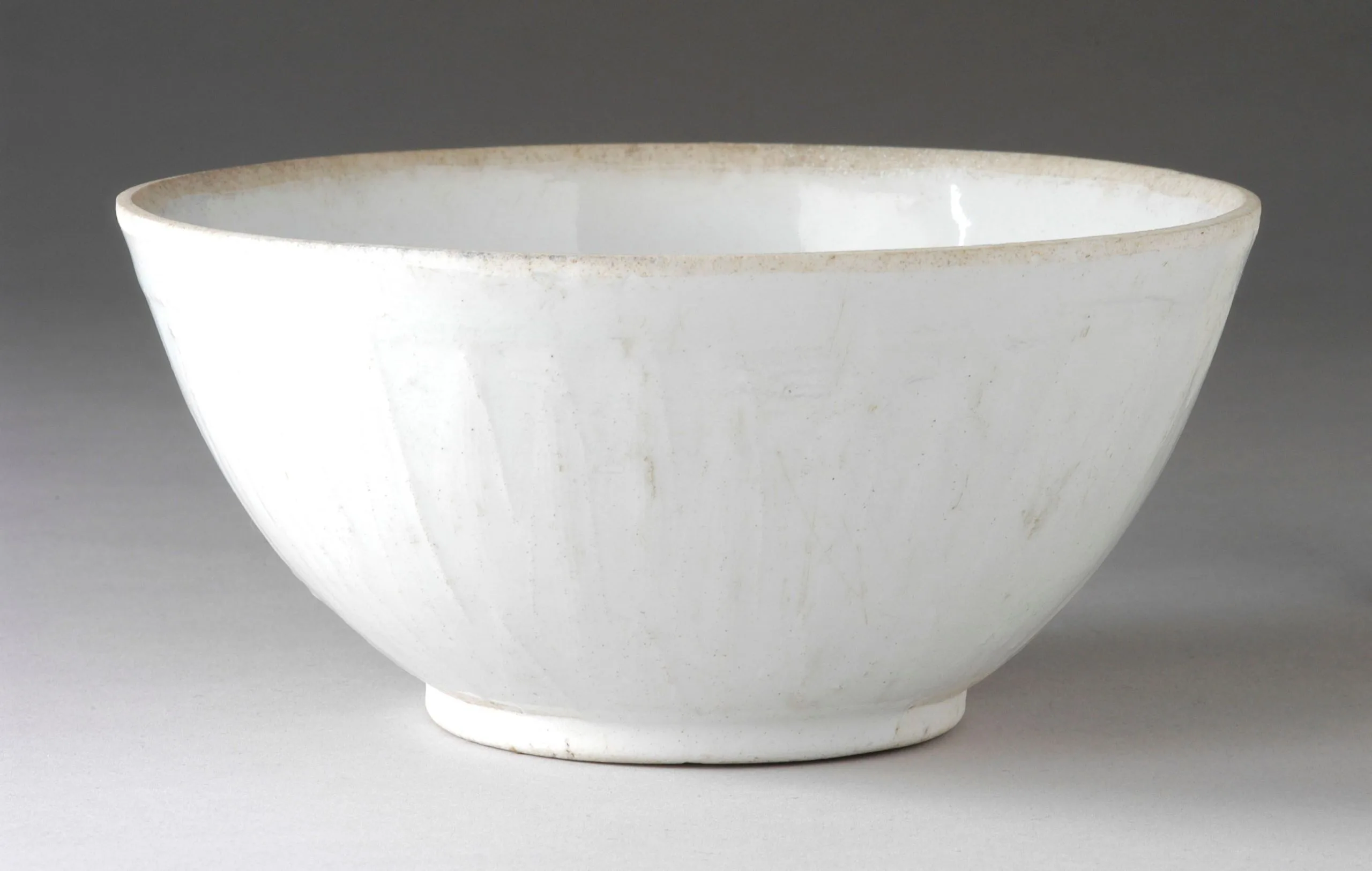 Ceramic bowl with wide mouth, gently curving walls, and an overall white glaze with faint vertical facets on the exterior