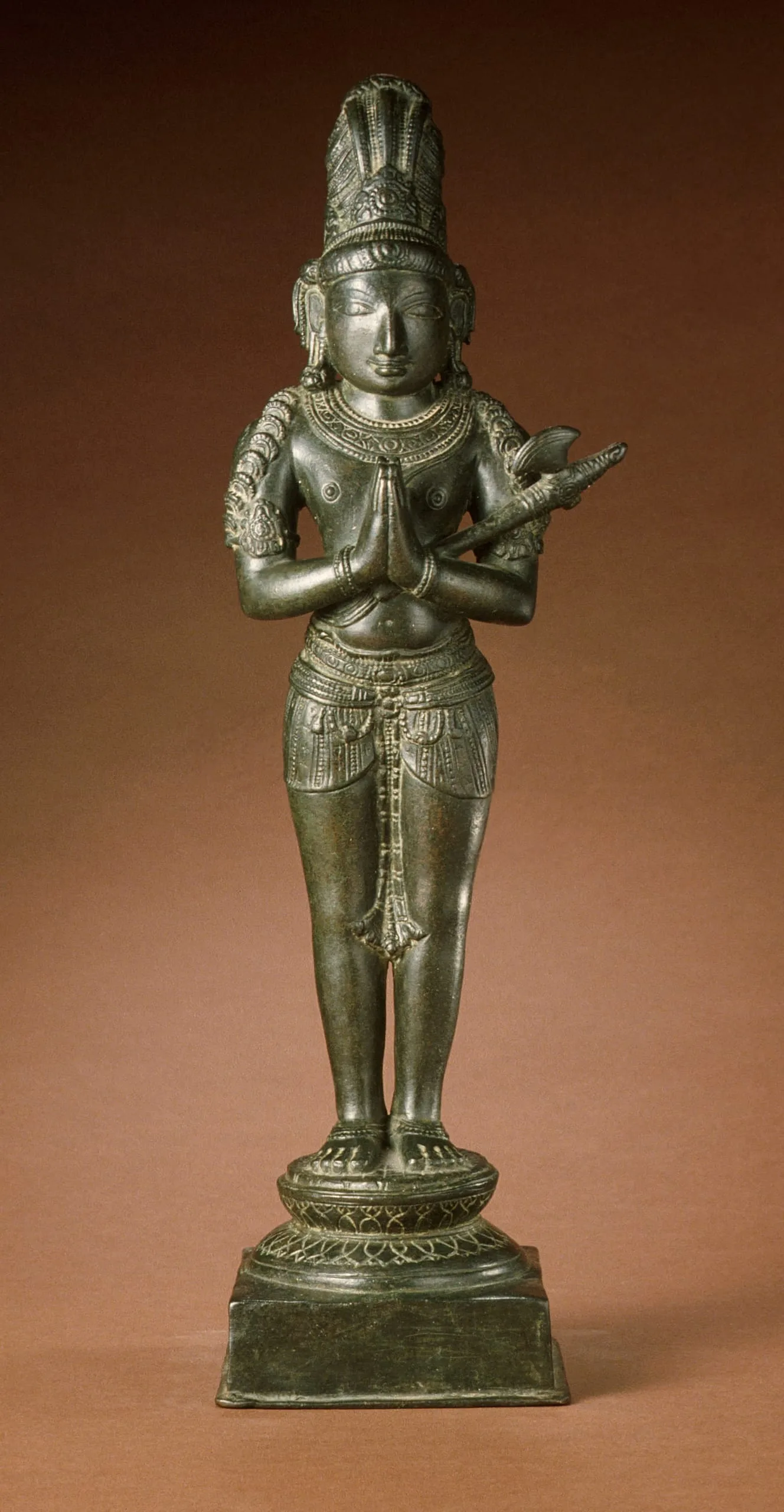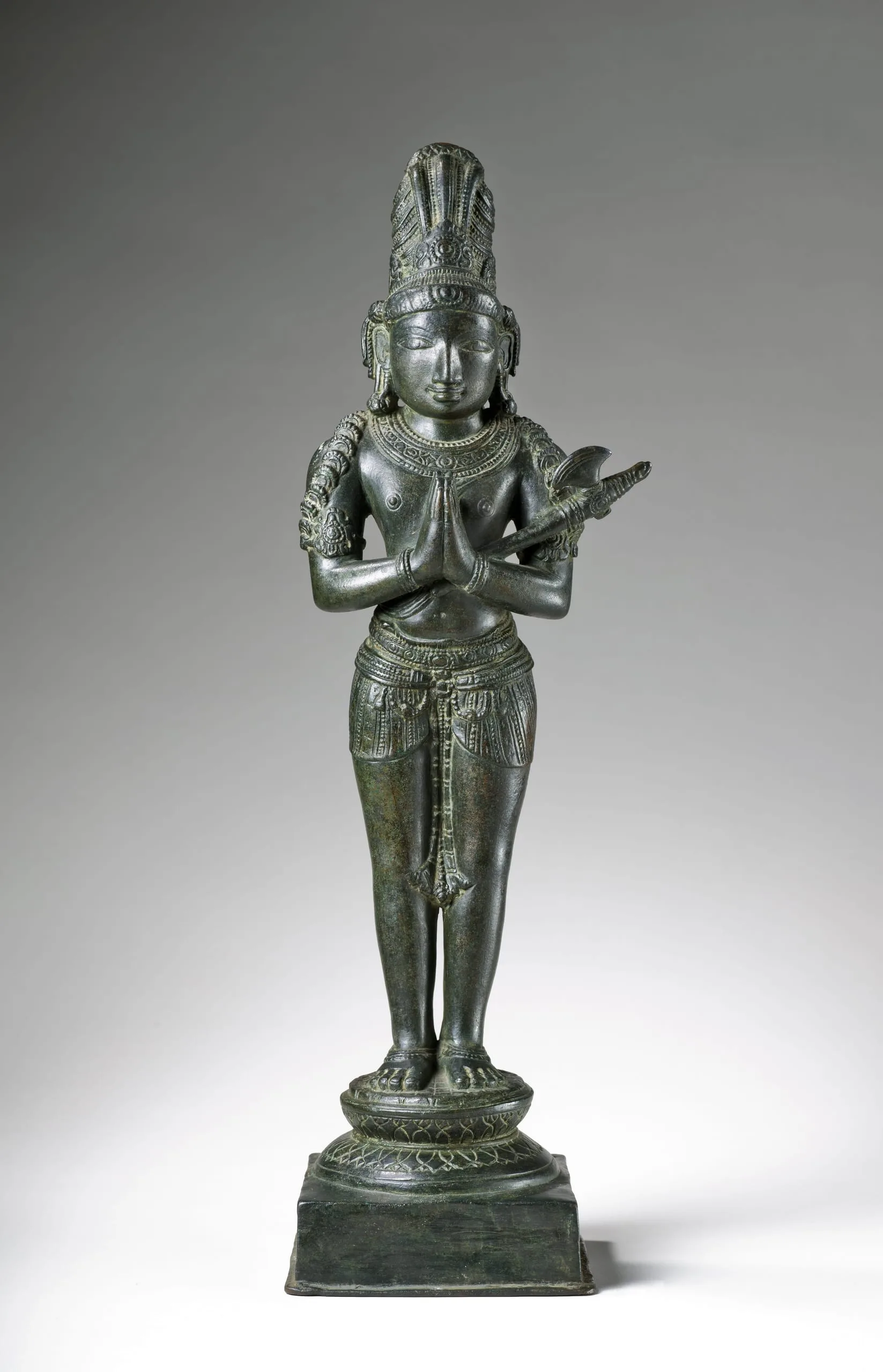 Chandikeshvara has an ascetic’s piled hair (jata mukuta) with two long ponytails draped over his shoulders. He is heavily ornamented and wears a short dhoti. He stands in a stiff, frontal pose (samapada sthanaka) on a double lotus base. His hands are held in the gesture of adoration (anjali mudra) and he carries an axe (parashu) in the crook of his left arm.