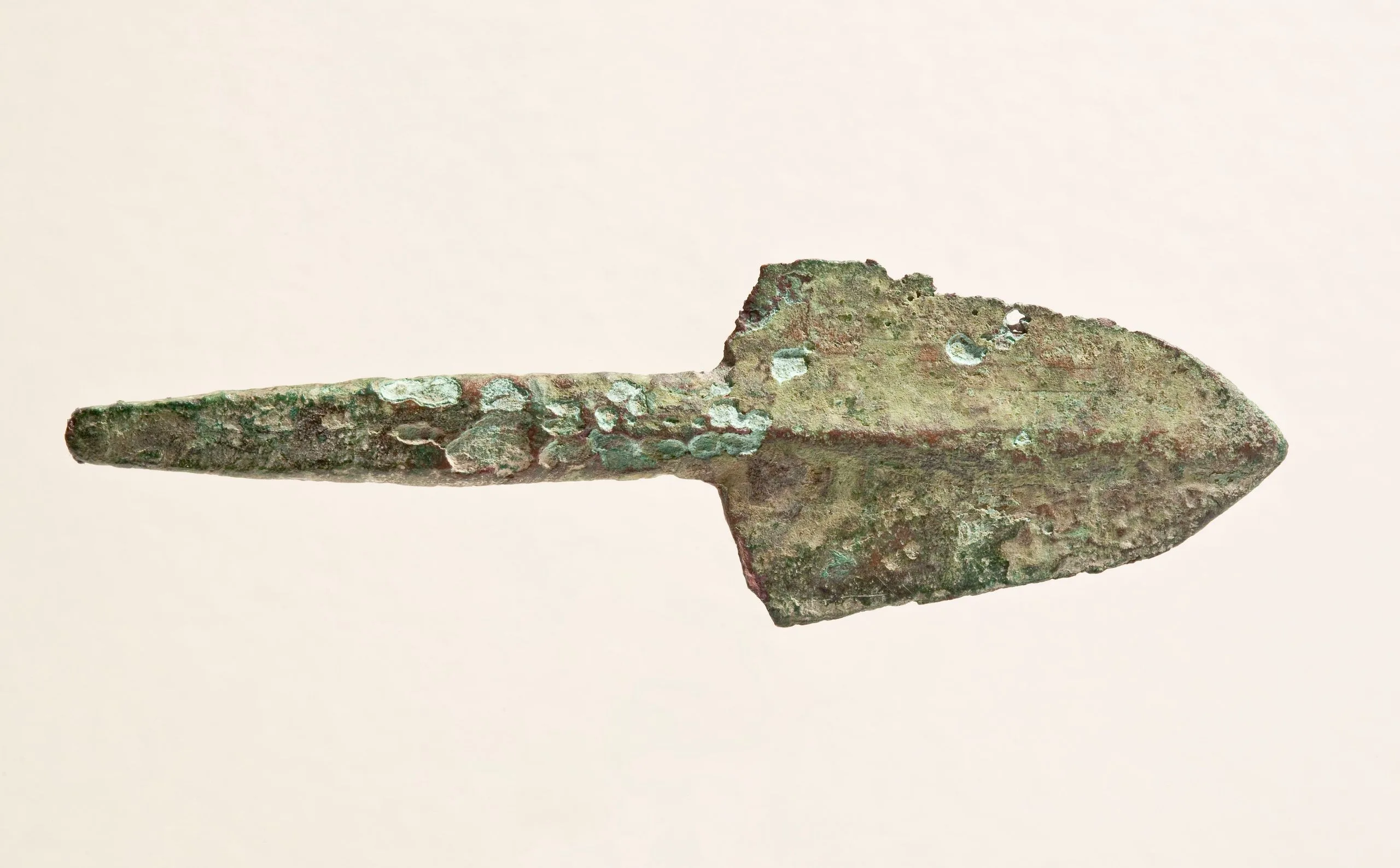 Ancient bronze spearhead or arrowhead with heavy green and turquoise patina, rough corroded surface, diagonal orientation against cream background