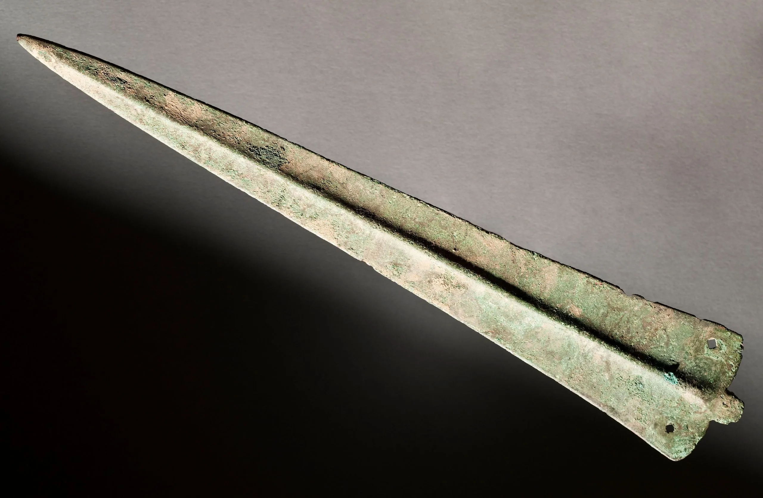 Bronze spearhead or dagger blade with a raised central ridge, heavily patinated in green and brown, with rivet holes at the base