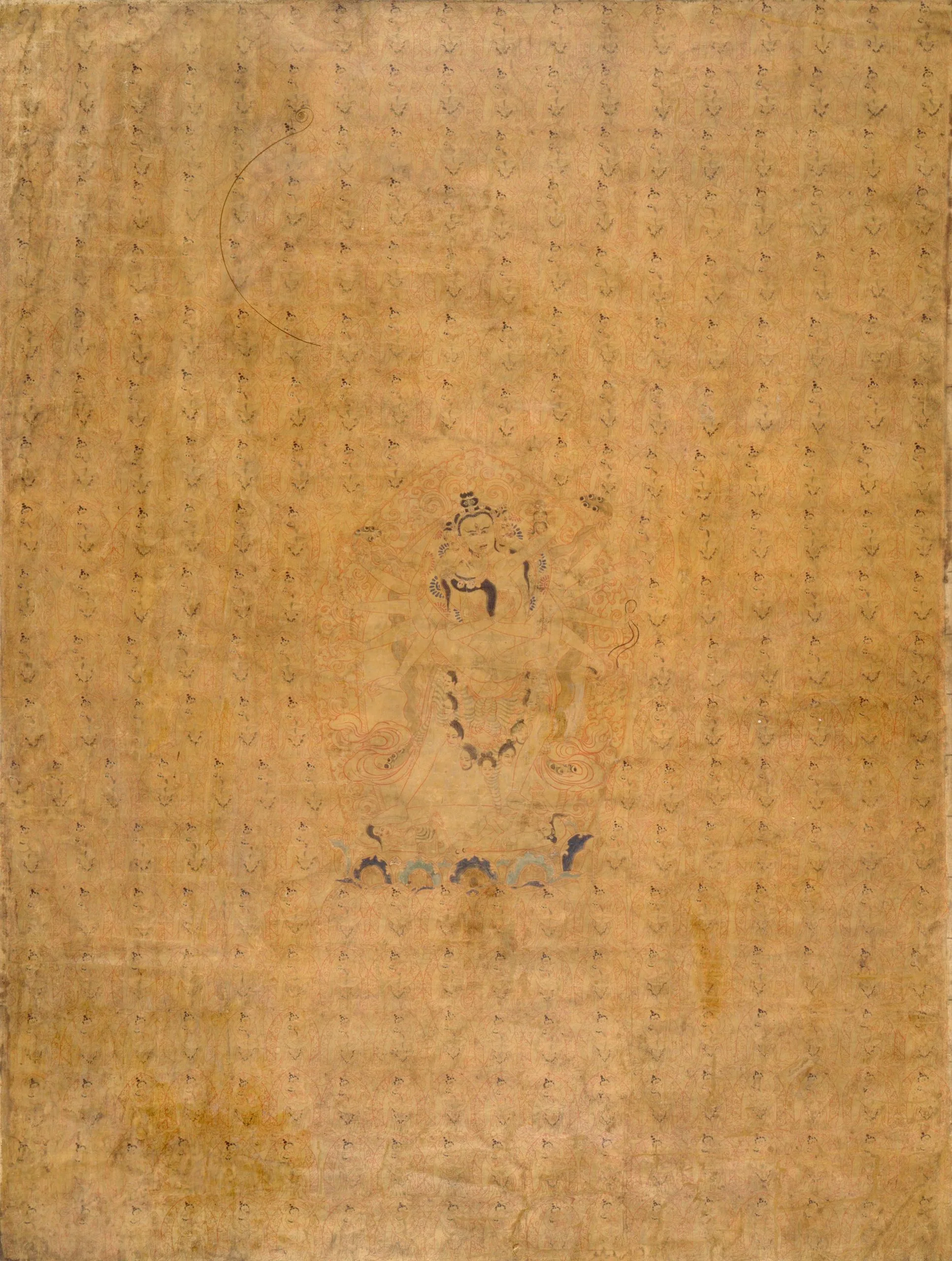 The principal figures in this gold-field painting are the archetypal deities of Tibetan Vajrayana (esoteric) Buddhism: the twelve-armed Chakrasamvara (Circle of Supreme Bliss), who symbolizes the Buddha’s infinite compassion, embracing his female aspect Vajravarahi (Diamond Sow), who represents the transcendent wisdom of a Buddha. Their union embodies the all-pervading bliss of complete enlightenment. Chakrasamvara and Vajravarahi are surrounded by multiple smaller depictions of themselves, identical except that each diminutive Chakrasamvara has only two arms. Repetitive representations such as this were intended to multiply the efficacy of the deities portrayed or to increase the merit attained by the patron who commissioned the painting.