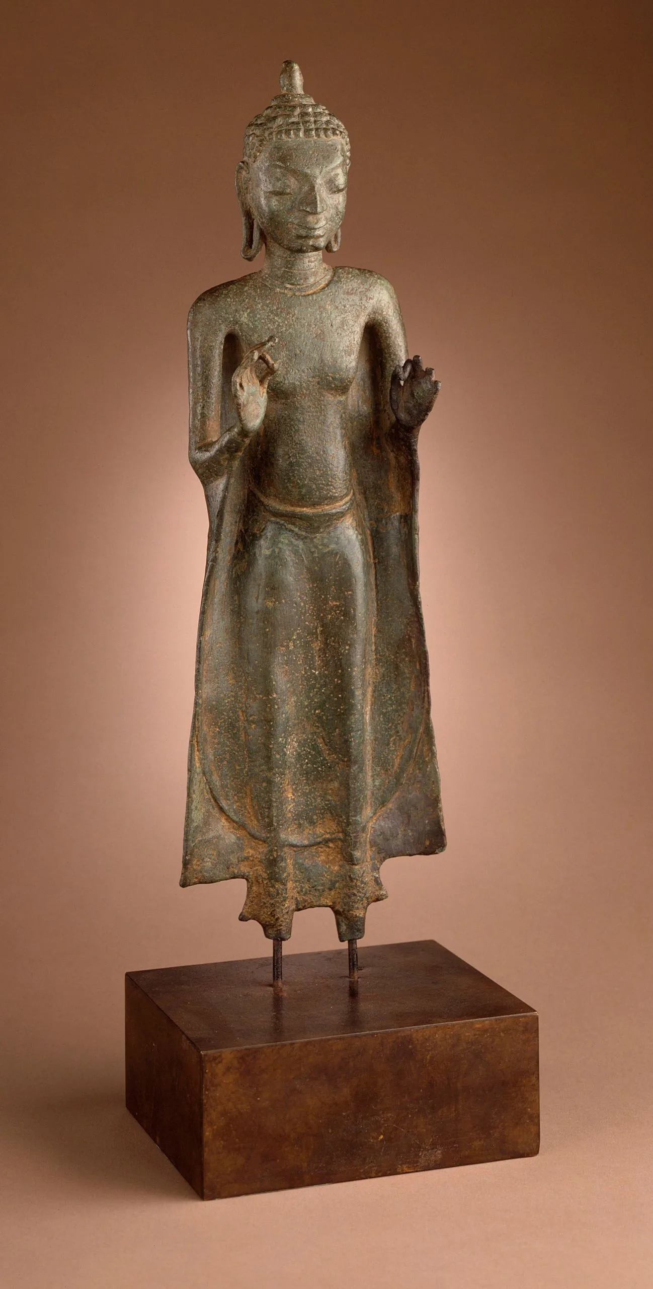 This standing bronze Thai Buddha is a classical example of Dvaravati sculpture. It has a characteristically slim, elegant body and swelling limbs and a frontal and symmetrical stance with hands raised in a double gesture of explanation. The serene face has distinctive Mon features. The treatment of the body and transparent garment reveals the influence of Gupta images from Sarnath and perhaps Ajanta, but the symmetry and frontality, not found in these Indian prototypes, are Thai traits.