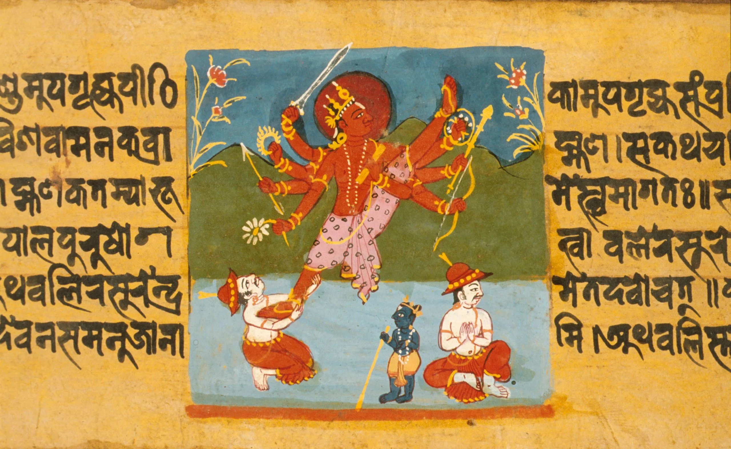 In this late 18th-century Nepalese manuscript illustration, Trivikrama stands with his left leg upraised and pointed to the heavens to represent his three cosmic strides. He is crowned, nimbate, and has red skin and eight arms. In his right hands, he holds a sword, discus, arrow, and a lotus (top to bottom). In his left hands, he holds a shield, mace, bow, and a religious manuscript representing the Vedas. He wears Vishnu’s floral garland (vana mala) and the Brahmanical sacred thread (yajnopavita) over his left shoulder. Beneath Trivikrama is the blue-skinned dwarf Vamana holding a mendicant’s staff. King Bali, wearing a Nepalese-style royal hat (see M.91.206), is shown twice in continuous narration. On the left, he is supporting Trivikrama’s right foot to indicate Vishnu’s domination. On the right, he is seated in the kingly posture of royal ease (maharajalila asana) and holding his hands in the gesture of devotion (anjali mudra).