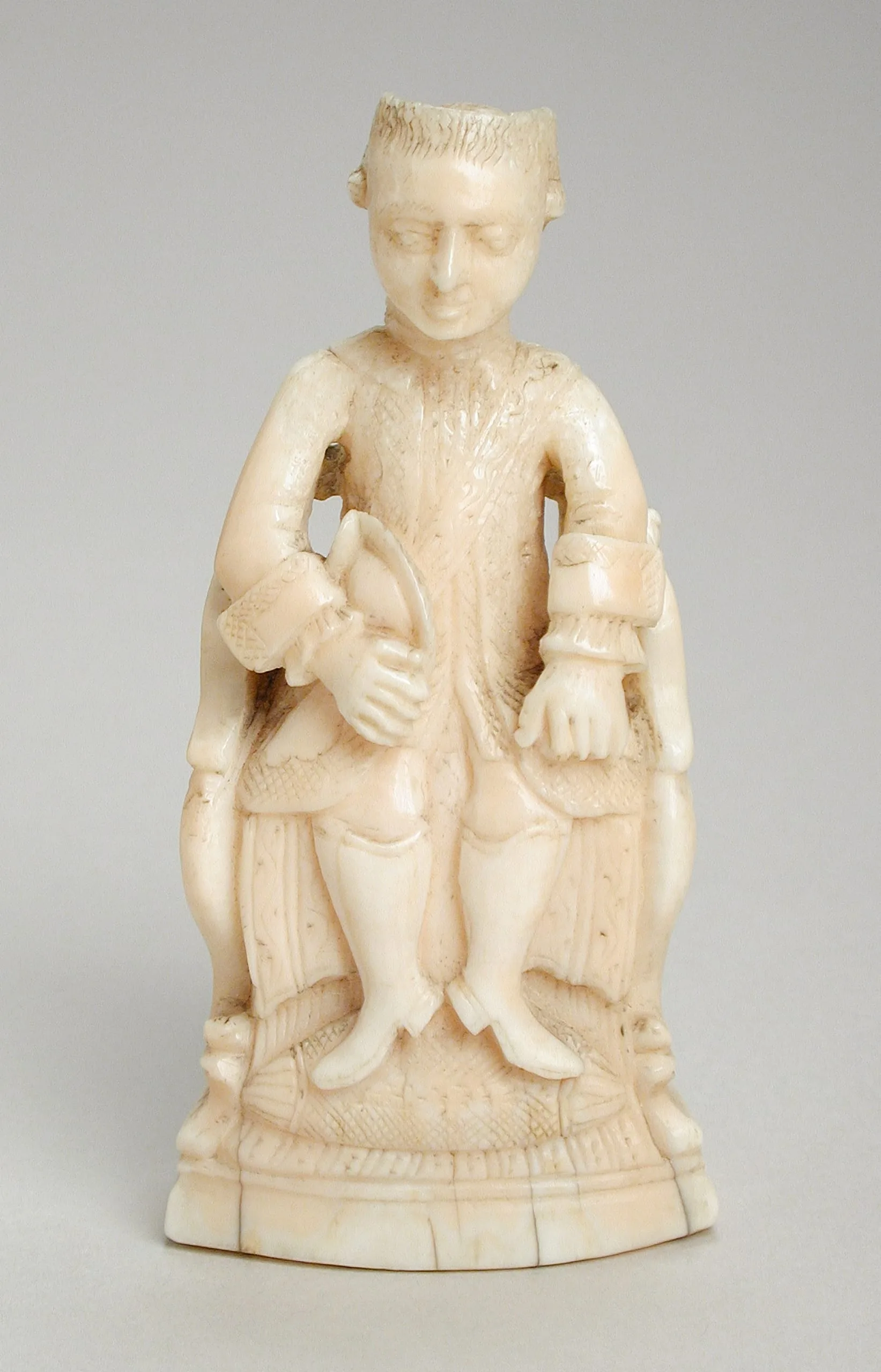 This ivory figurine of an English Official, and its companion portrayal of an Indian Civil Servant (M.89.131.3), are a parallel expression in sculpture of the numerous paintings, drawings, and photographs representing occupations that were popular among the many European residents and visitors in India during the 18th and 19th centuries. Besides bureaucrats, the occupations depicted include various native craftsmen, nautch dancing girls, soldiers, and circus performers. Similar portraits included illustrious rulers, majestic monuments, local scenery, and numerous studies of India's rich flora and fauna. This English official wears a powdered wig, European jacket with upturned cuffs and broad lapels, dress shirt, and knee-length leather boots. He wears a sash over his shoulder and holds a hemispherical portfolio or ledger. He sits in a European-style chair, which is braced in a rear corner by an indigenous attendant. His feet rest on a bolster.