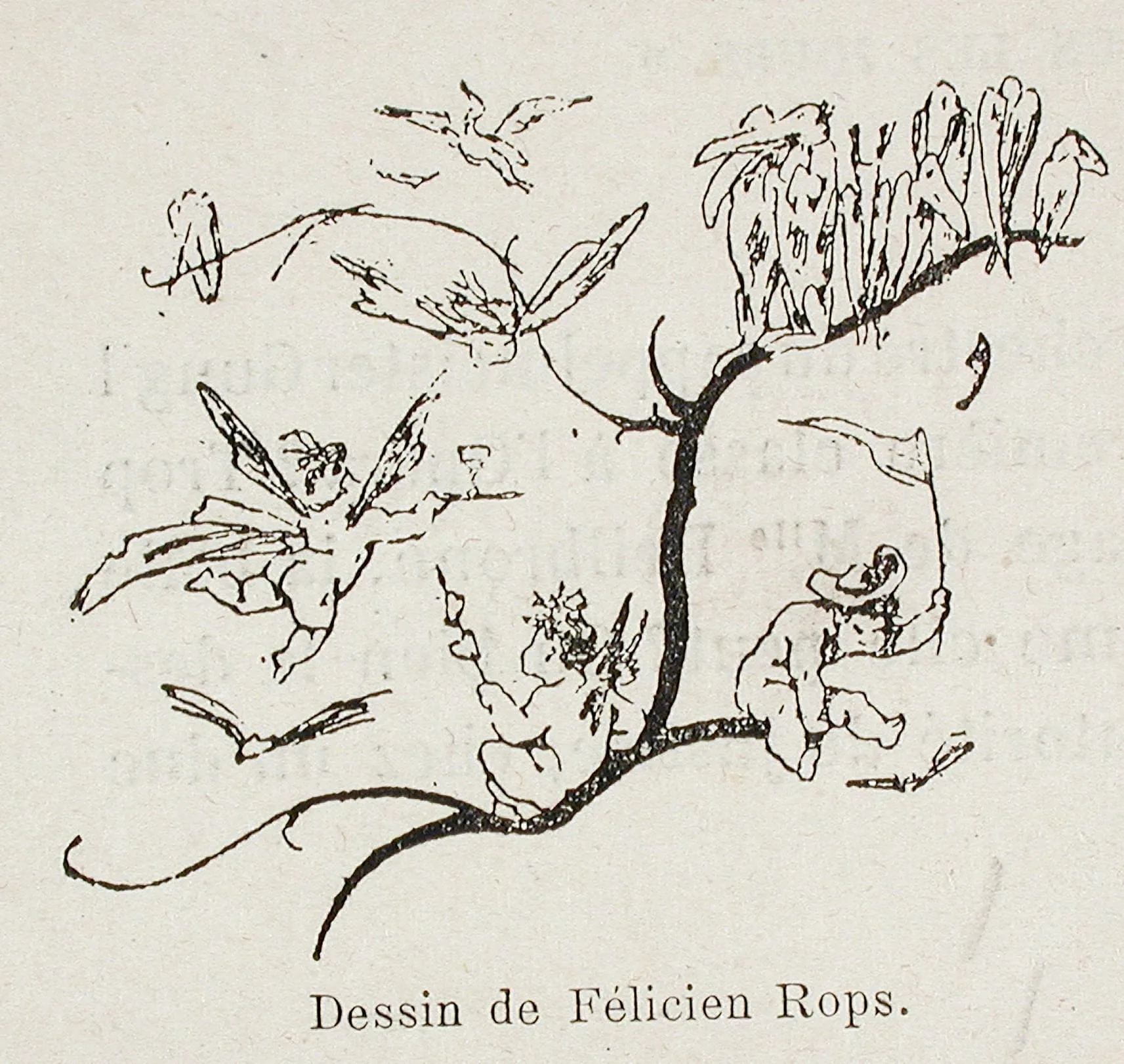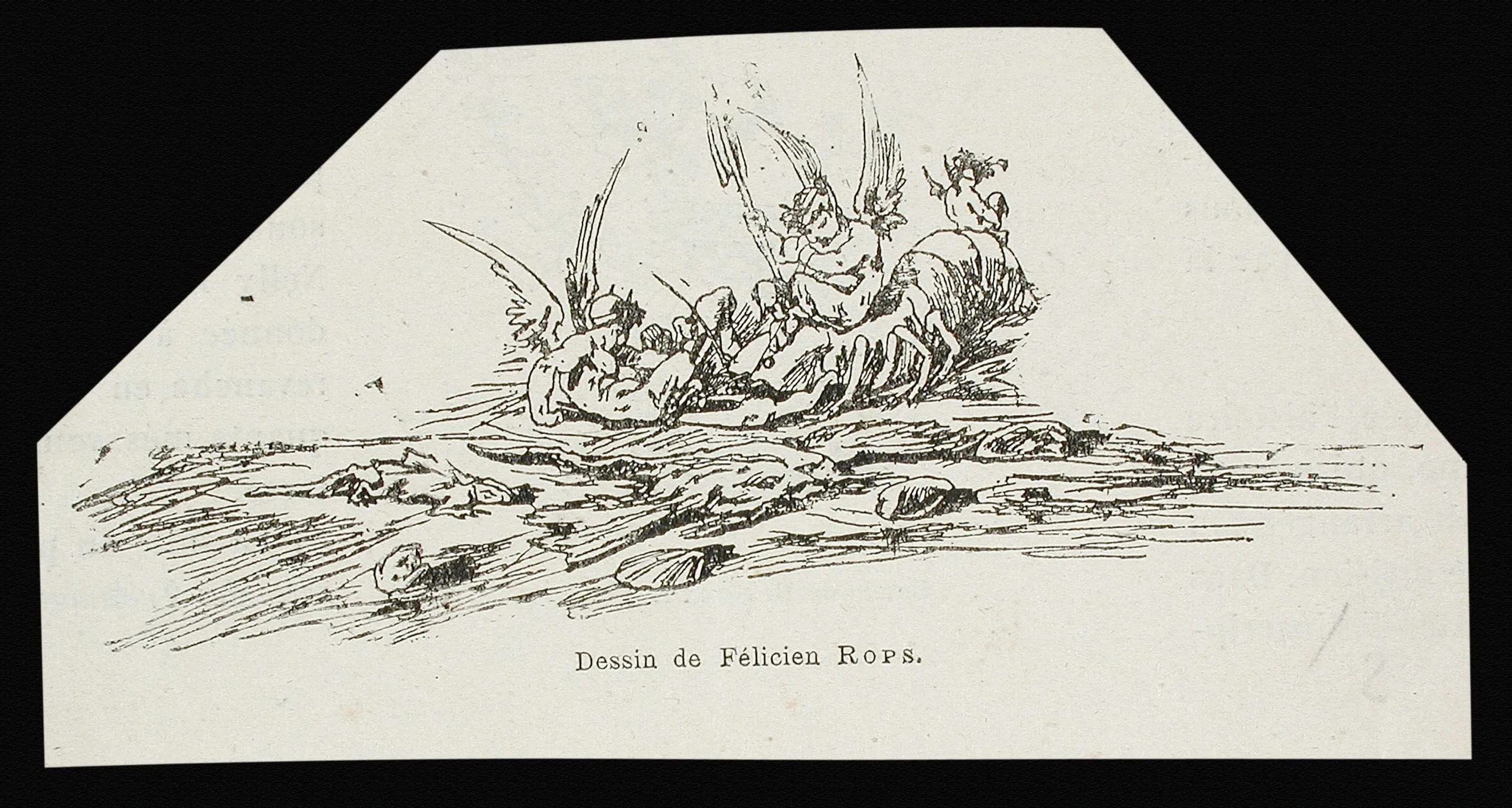 Printed reproduction of a pen-and-ink drawing on a hexagonal-cut card, depicting a group of winged figures and a rearing horse atop a rocky outcropping, rendered with fine cross-hatched linework. Caption in Latin script reads "Dessin de Félicien Rops."