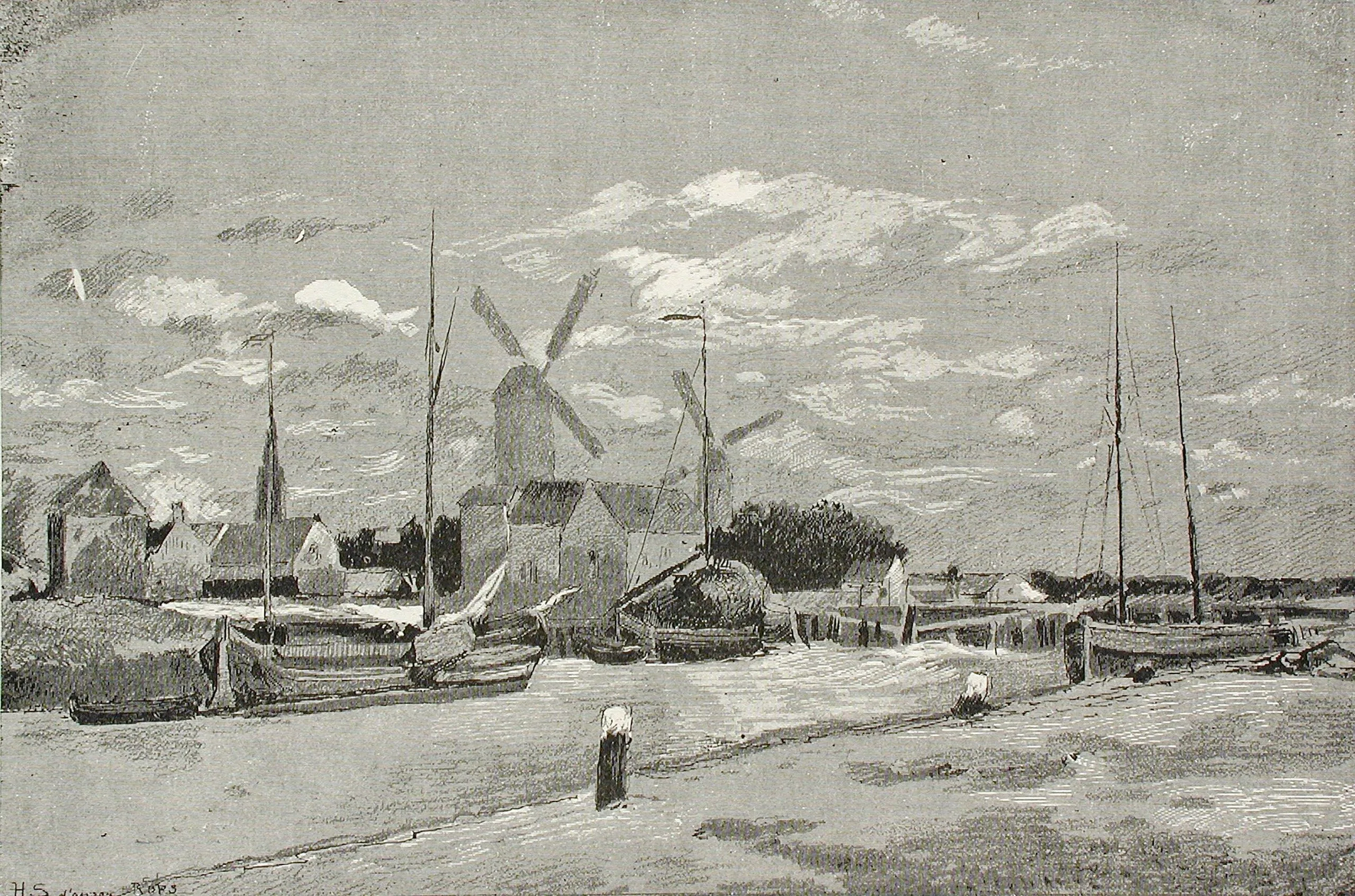 Horizontal print in gray tones depicting moored sailing boats and a windmill along a flat waterway, with a church steeple and low buildings in the distance under a cloudy sky