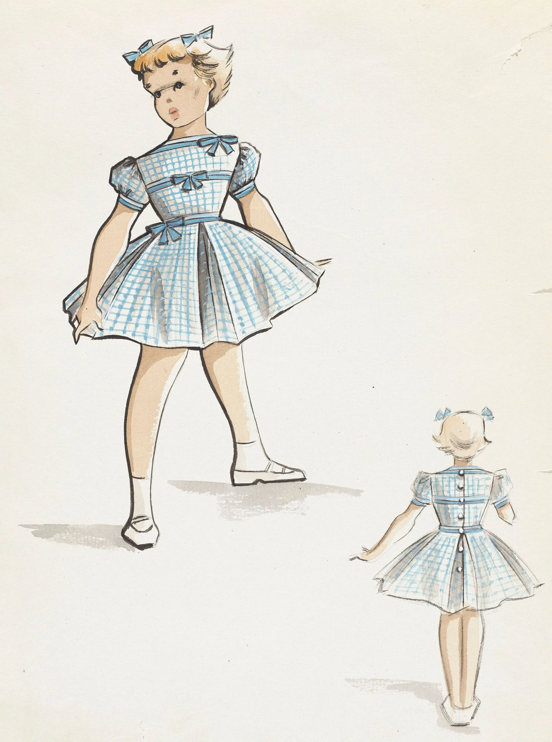 Ink and watercolor drawing on off-white paper showing two views of a stylized doll in a blue and white checked dress with teal bows — a large front view and a smaller rear view