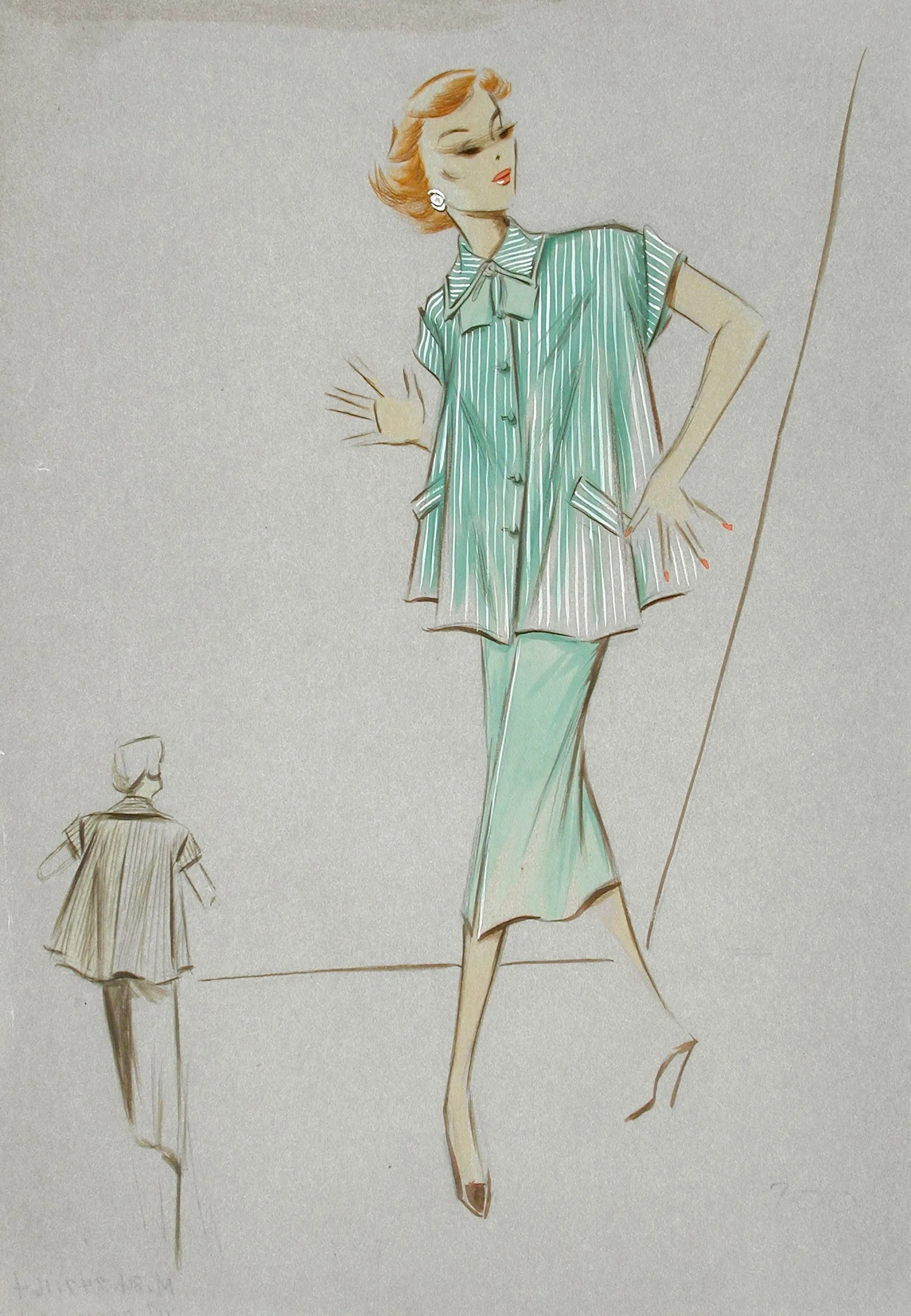 Fashion illustration in gouache and pencil on gray paper, full-length figure of a woman in a mint green striped blouse and slim skirt, with a small back-view sketch in the lower left corner