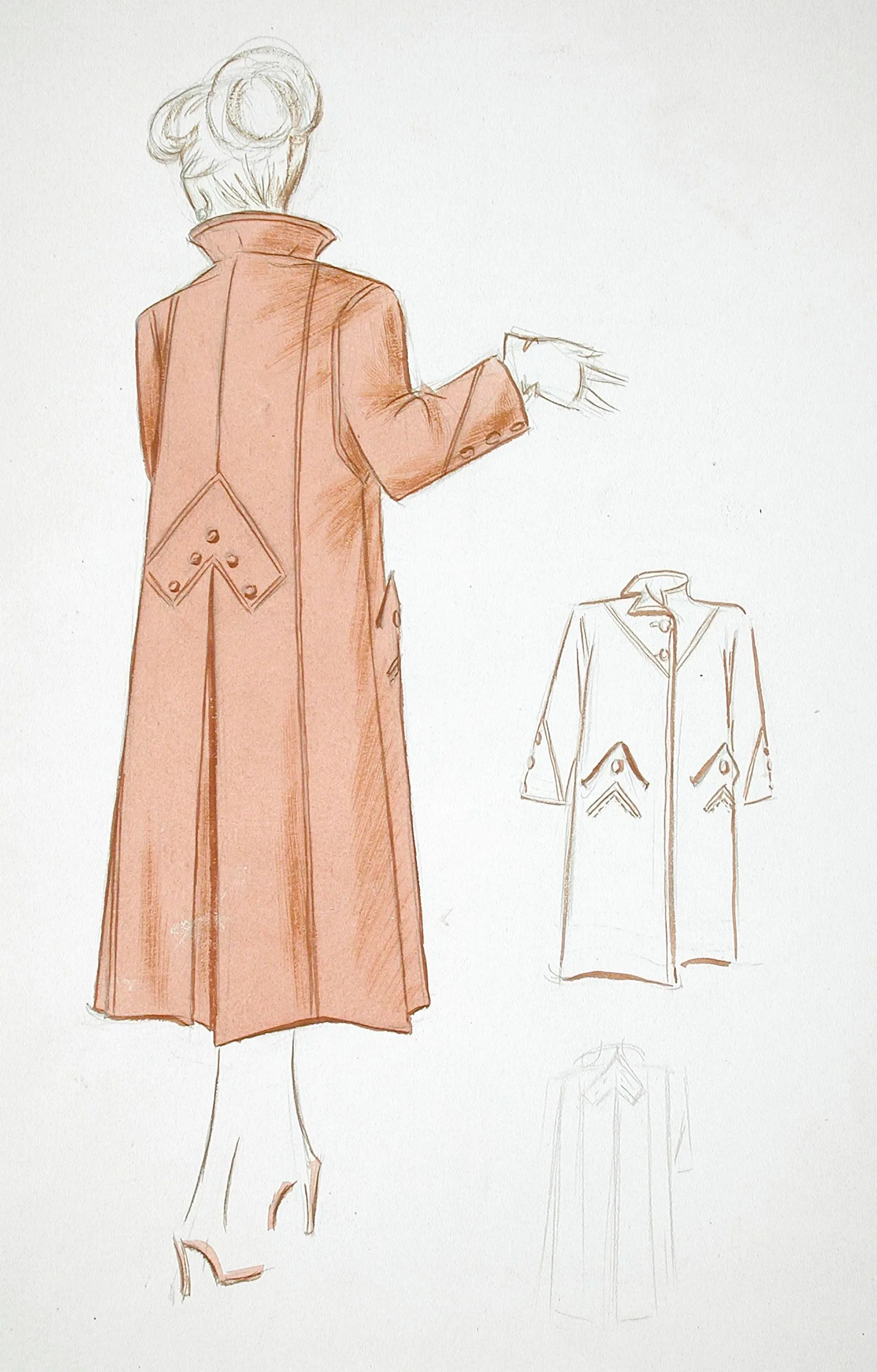Fashion drawing in pencil and salmon-pink wash showing a coat design from the back on a stylized female figure, with two smaller front-view sketches to the lower right