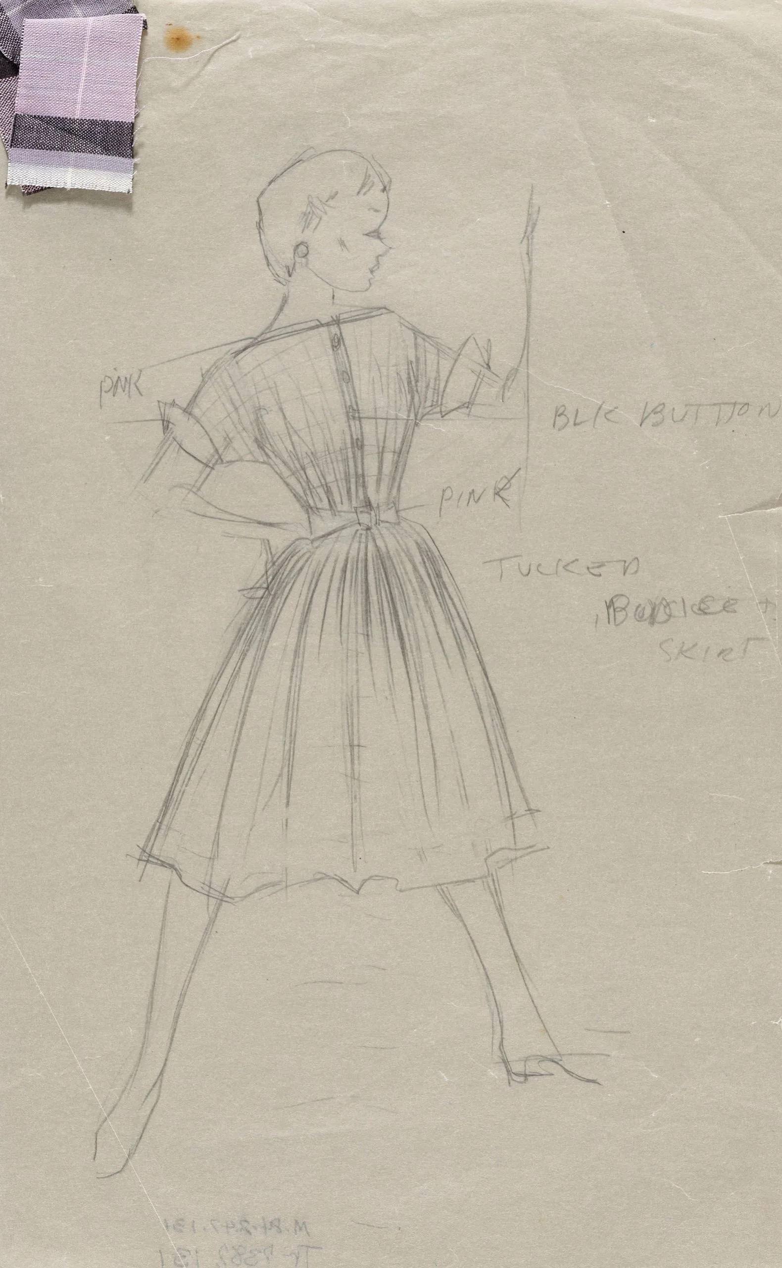 Pencil fashion design sketch on sage green-gray paper showing a woman from behind in a belted, full-skirted dress, with handwritten annotations and two fabric swatches pinned to the upper left corner