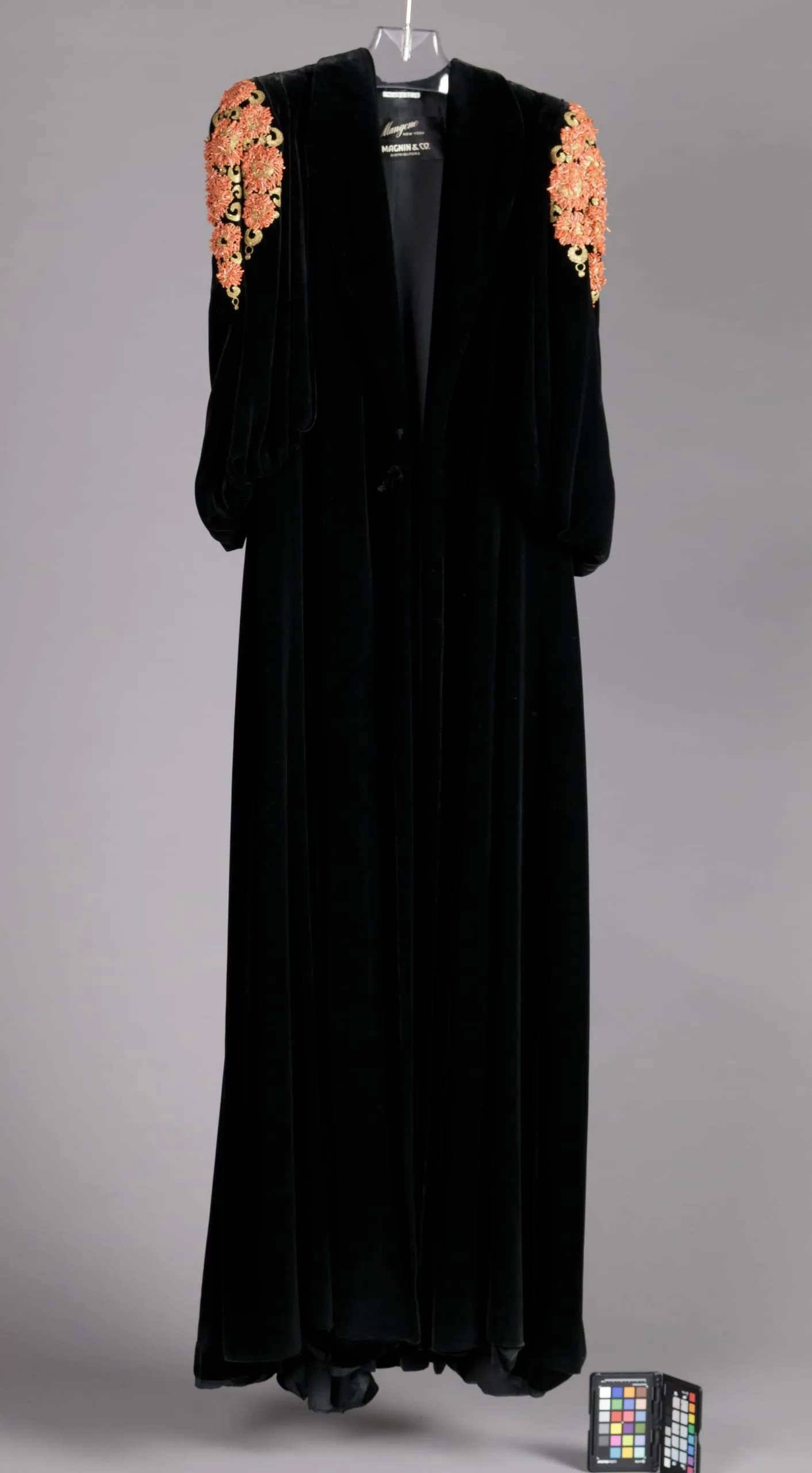 - Silk velvet, coral beads, metallic thread embroidery.