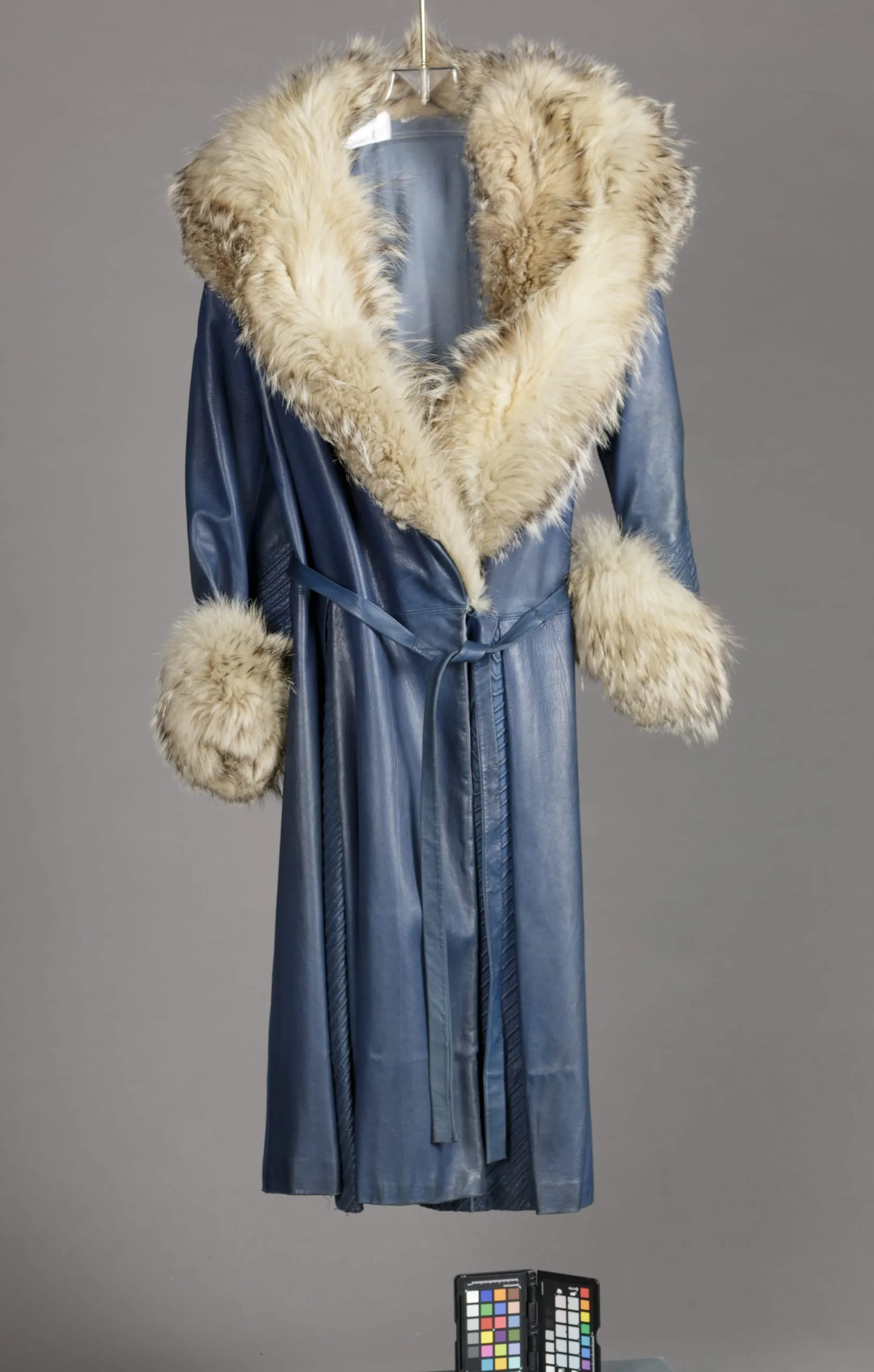 - Coat: leather and fur, wool twill; Belt: leather