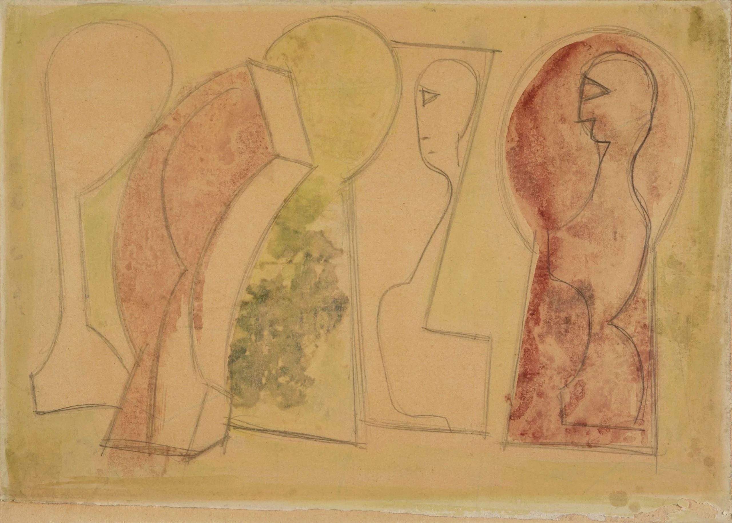 Watercolor and pencil drawing on aged cream paper, three abstracted standing figures in profile rendered with loose lines and pale washes of pink, yellow-green, and terra cotta