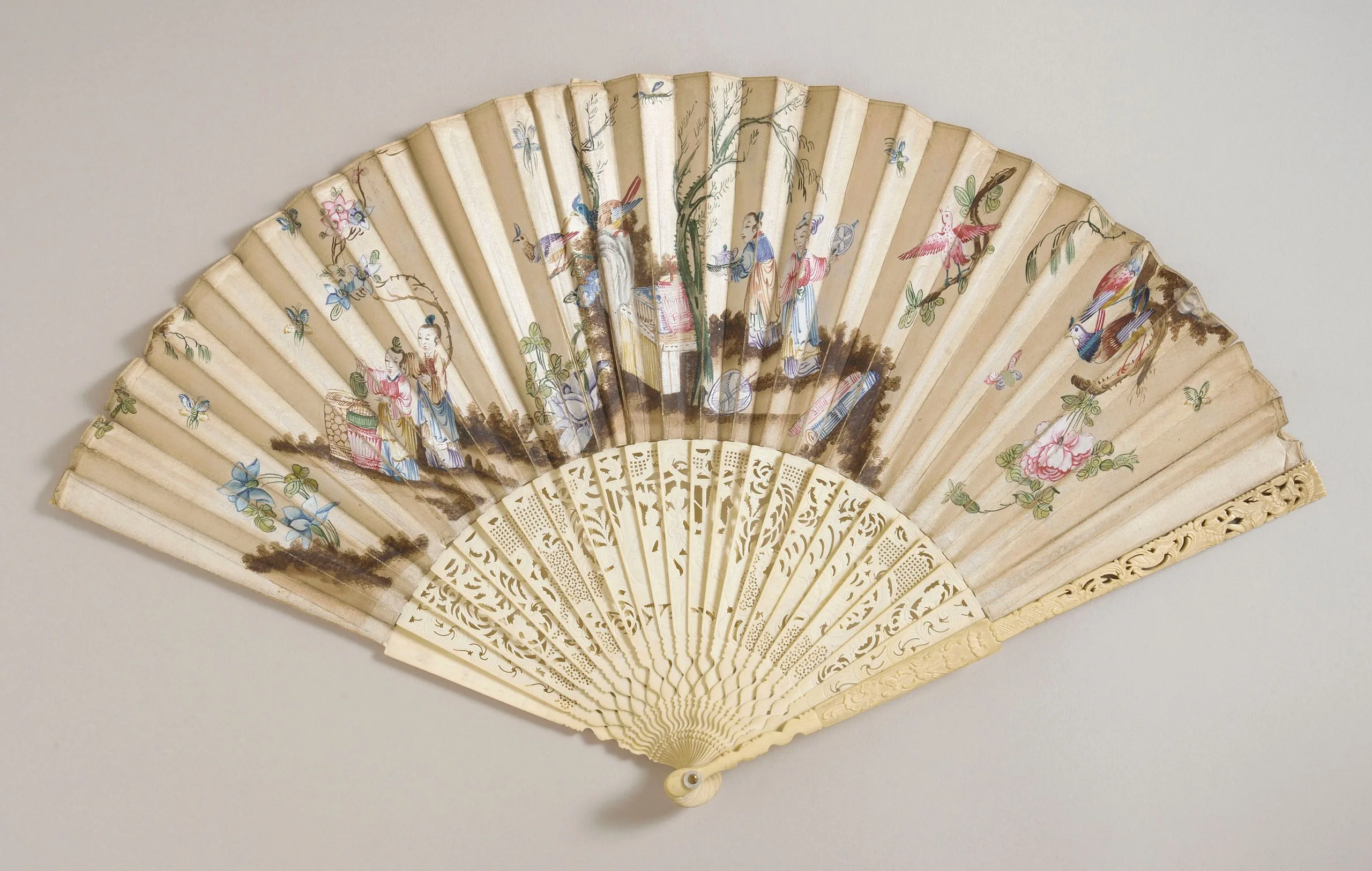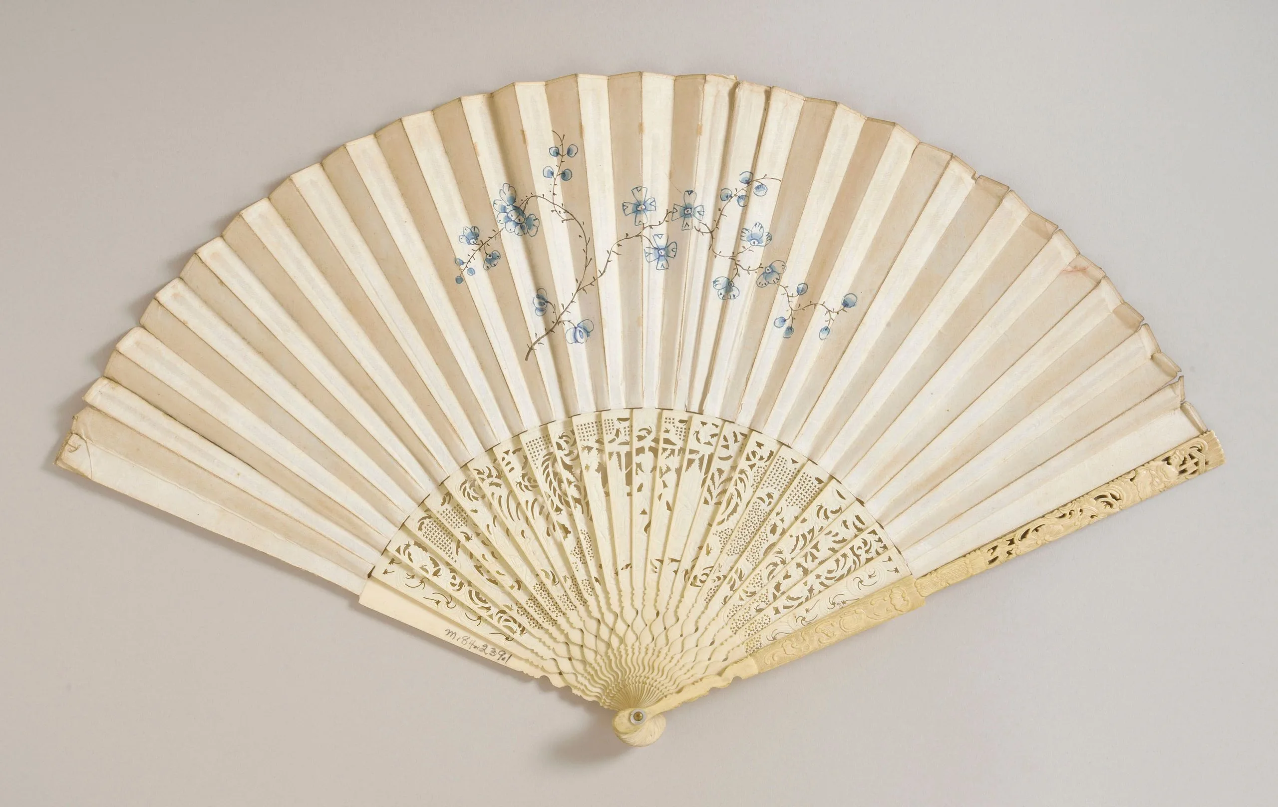 - Paper leaf, painted, gold leaf, bone sticks and guards, brass metallic rivet, mother-of-pearl button