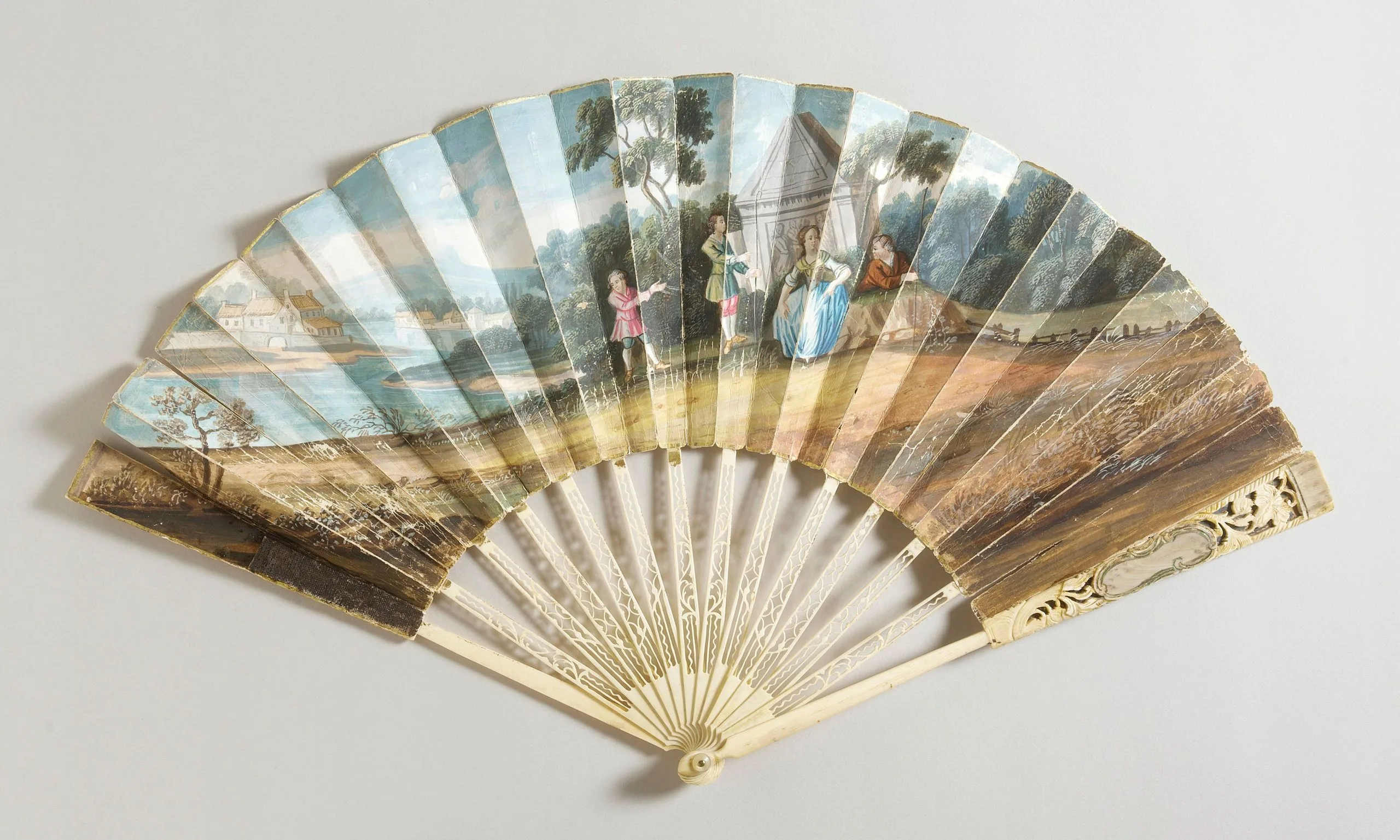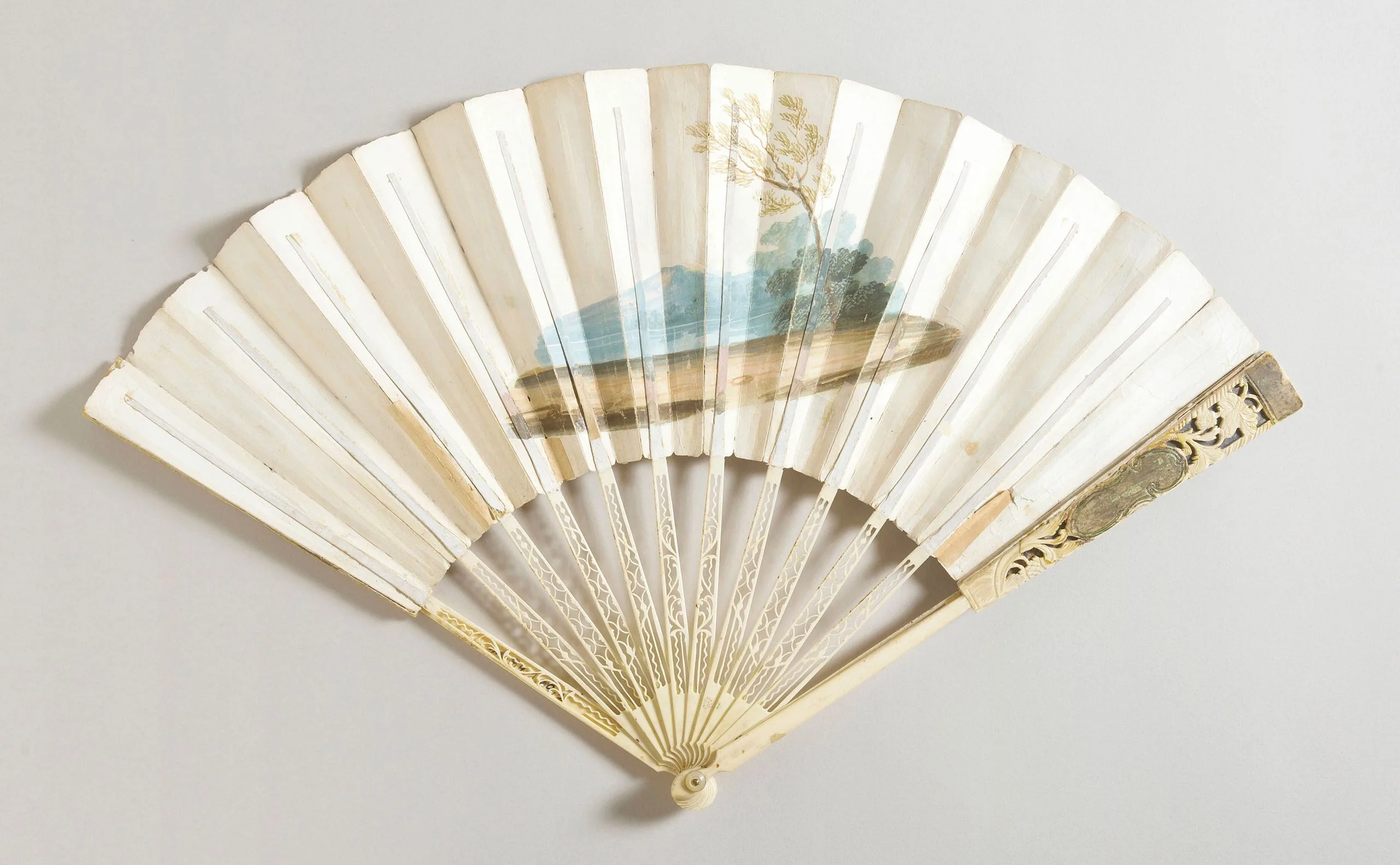 - Gouache on paper leaf, ivory sticks, mother-of-pearl button, brass metal rivet