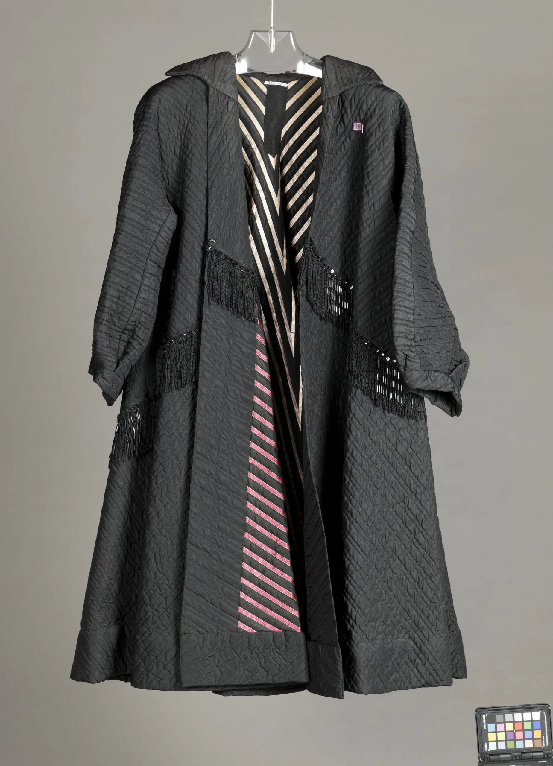 - Silk plain weave, quilted, with silk braid, silk fringe, plastic sequins.