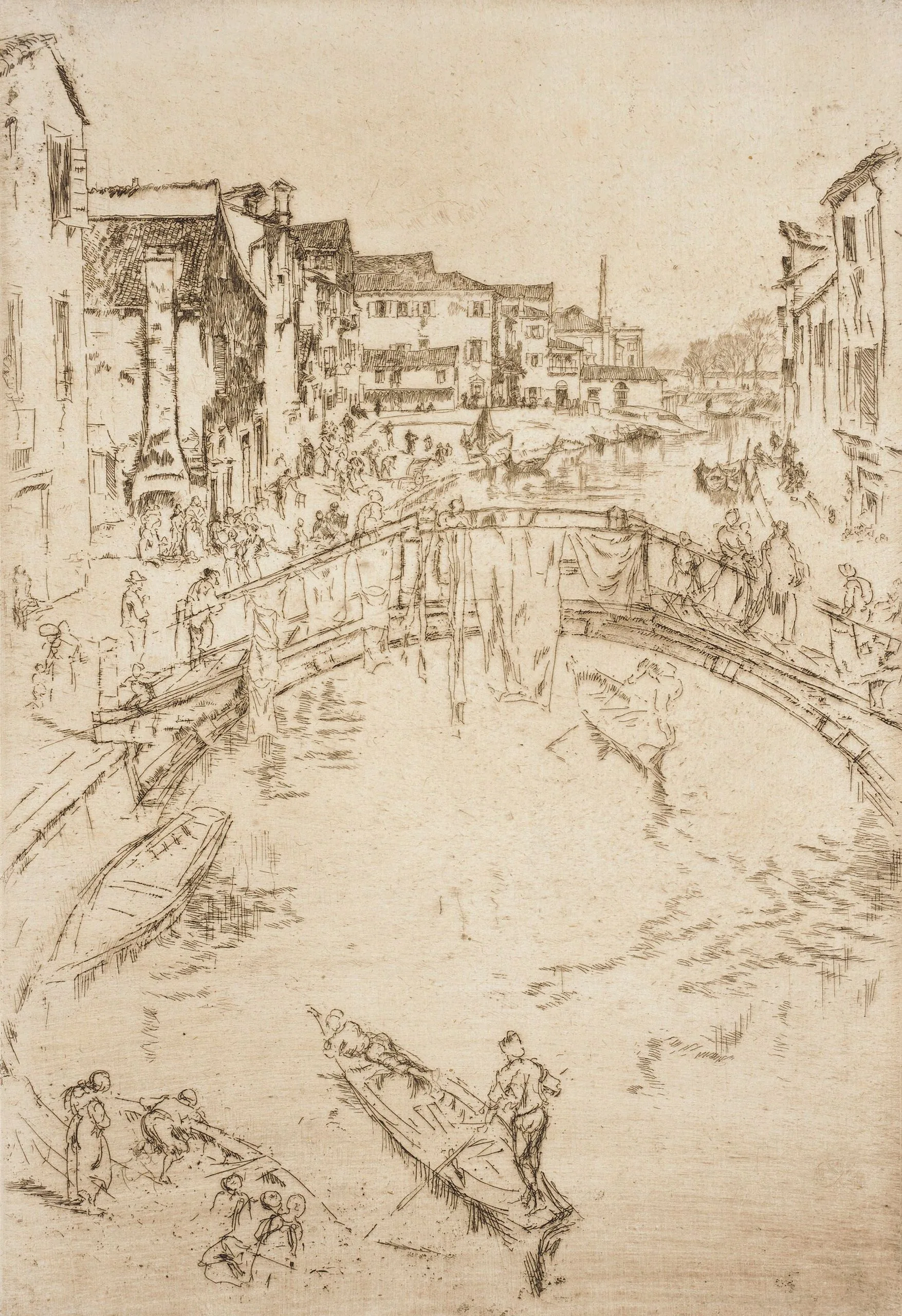 Whistler was deeply influenced by compositions and motifs of Japanese prints, which often feature a high horizon line and a bridge. Here he combined Japanese structure and elements with his characteristic sketchy technique. The delicately drawn figures and faintly hatched lines invoke the activity of the neighborhood scene and conjure up a breeze rippling the water and fluttering the sheets drying on the bridge.