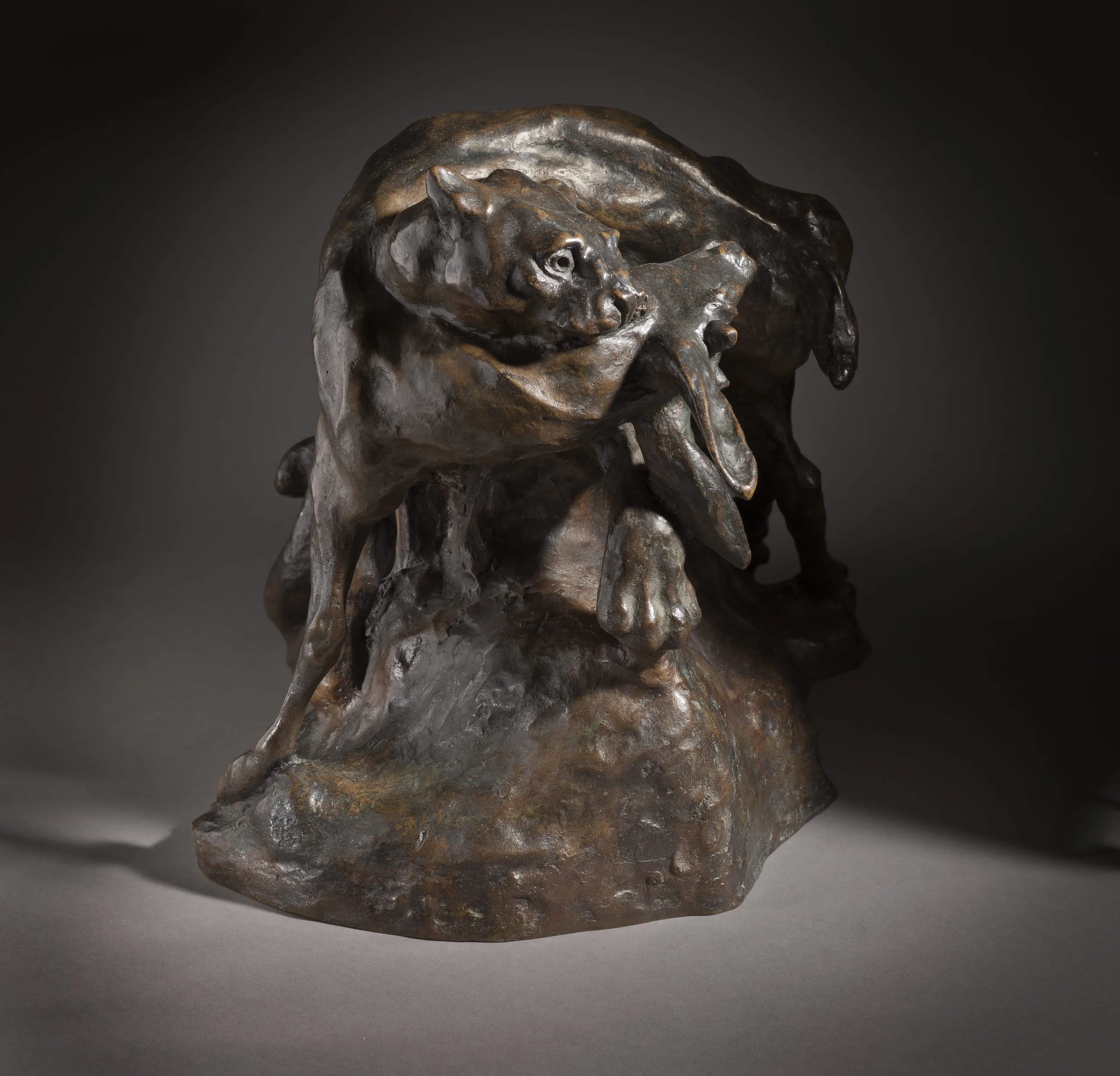 Several influences combined in Putnam’s distinctive work: the powerful animal subject matter of Antoine-Louis Barye (1796-1875), the fluid modeling of Auguste Rodin (1840-1917), and the artist’s own knowledge of California wildlife. Pumas and other large cats were Putnam’s favorite subjects, usually rendered, as here, as immensely powerful creatures with heavy, muscular limbs. In Puma and Deer the surging form of the puma is contrasted with that of the limp, lifeless deer carried across its back. Because of their vigorous modeling and lack of finish, Putnam’s works greatly appealed to modernists.