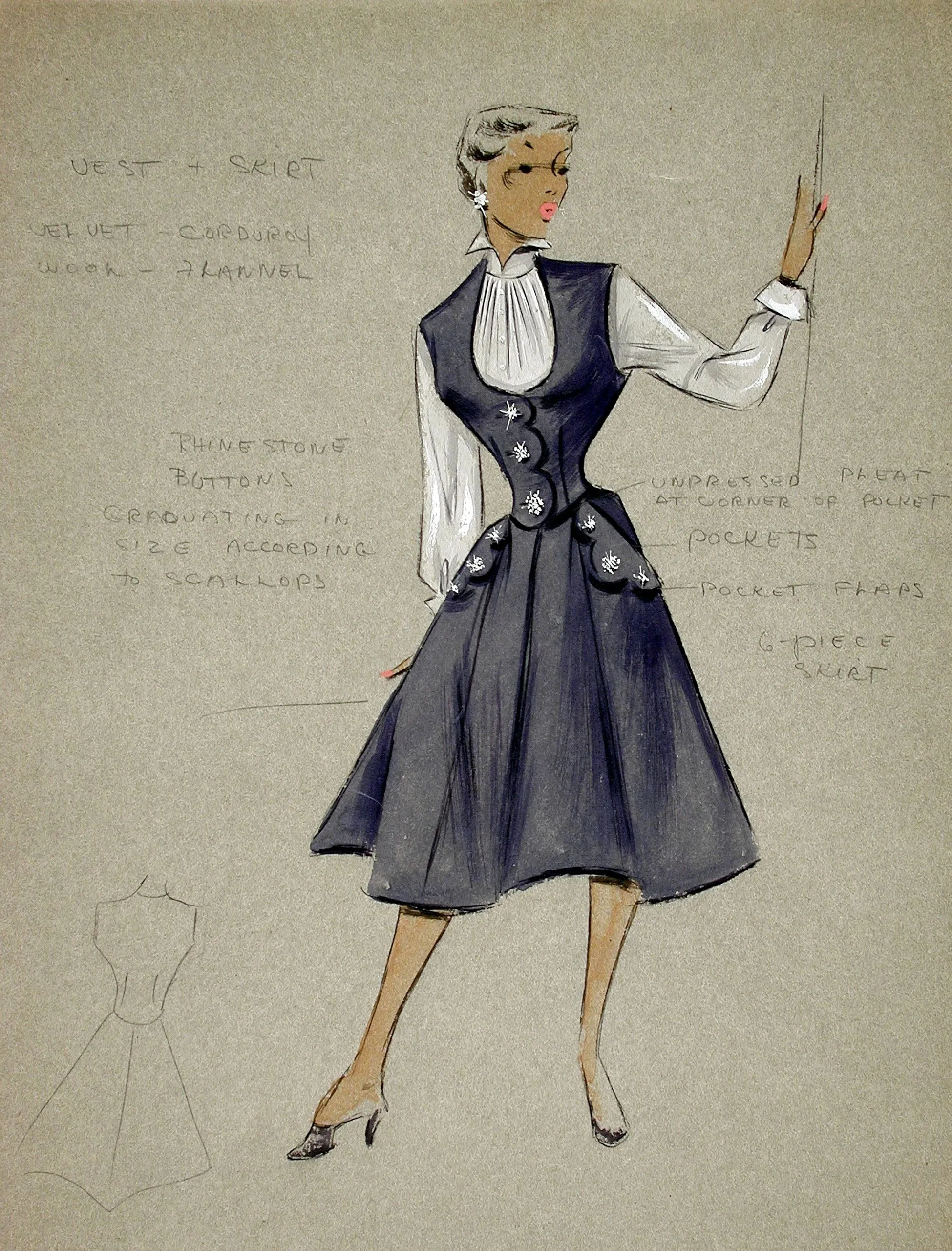 Fashion illustration in gouache and graphite on gray paper, full-length figure in a navy vest and flared skirt over a white blouse, with handwritten design annotations