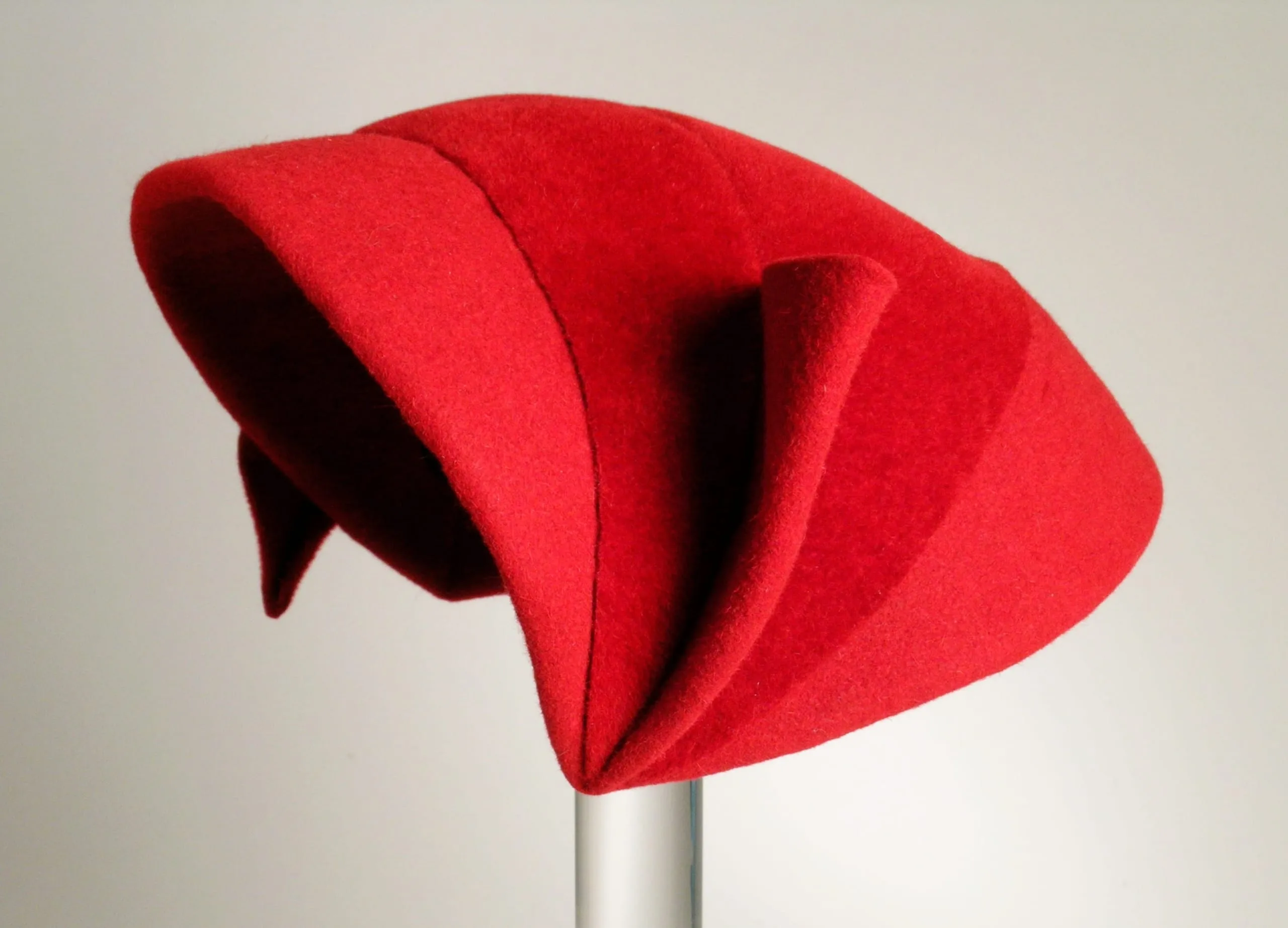 Crimson red felt hat with sculptural folded ridges across the crown and a wide curved brim, displayed on a silver cylindrical stand