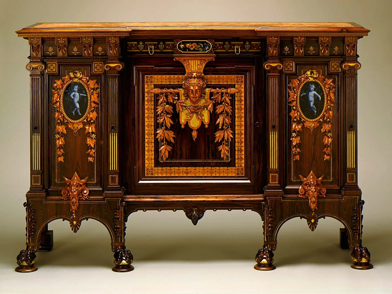 - Rosewood, maple, other exotic woods, pietre duré, marble, brass inlay, oil painted panels, velvet