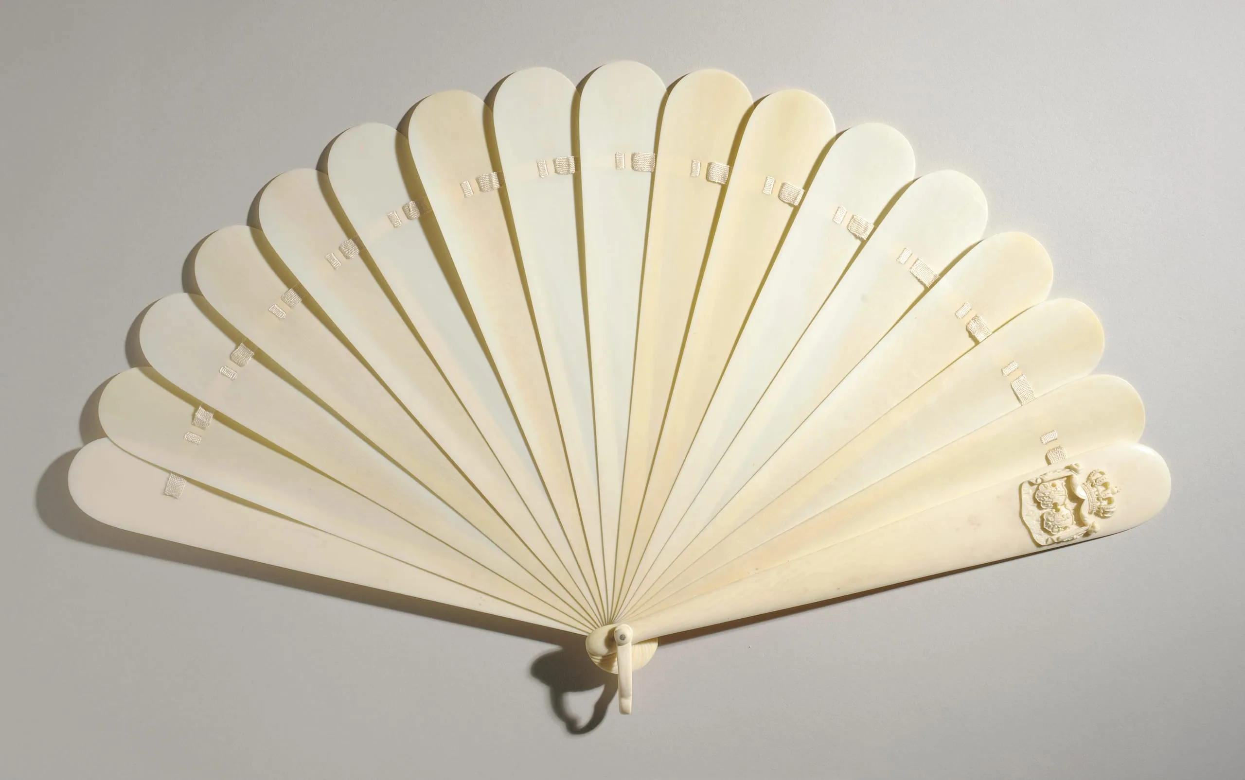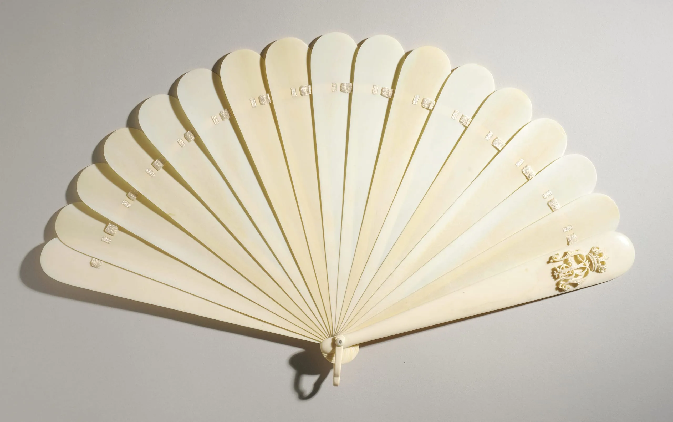 - a) Fan: Ivory sticks and loop, fifteen ivory leaves, silk ribbon; b) Box: paper