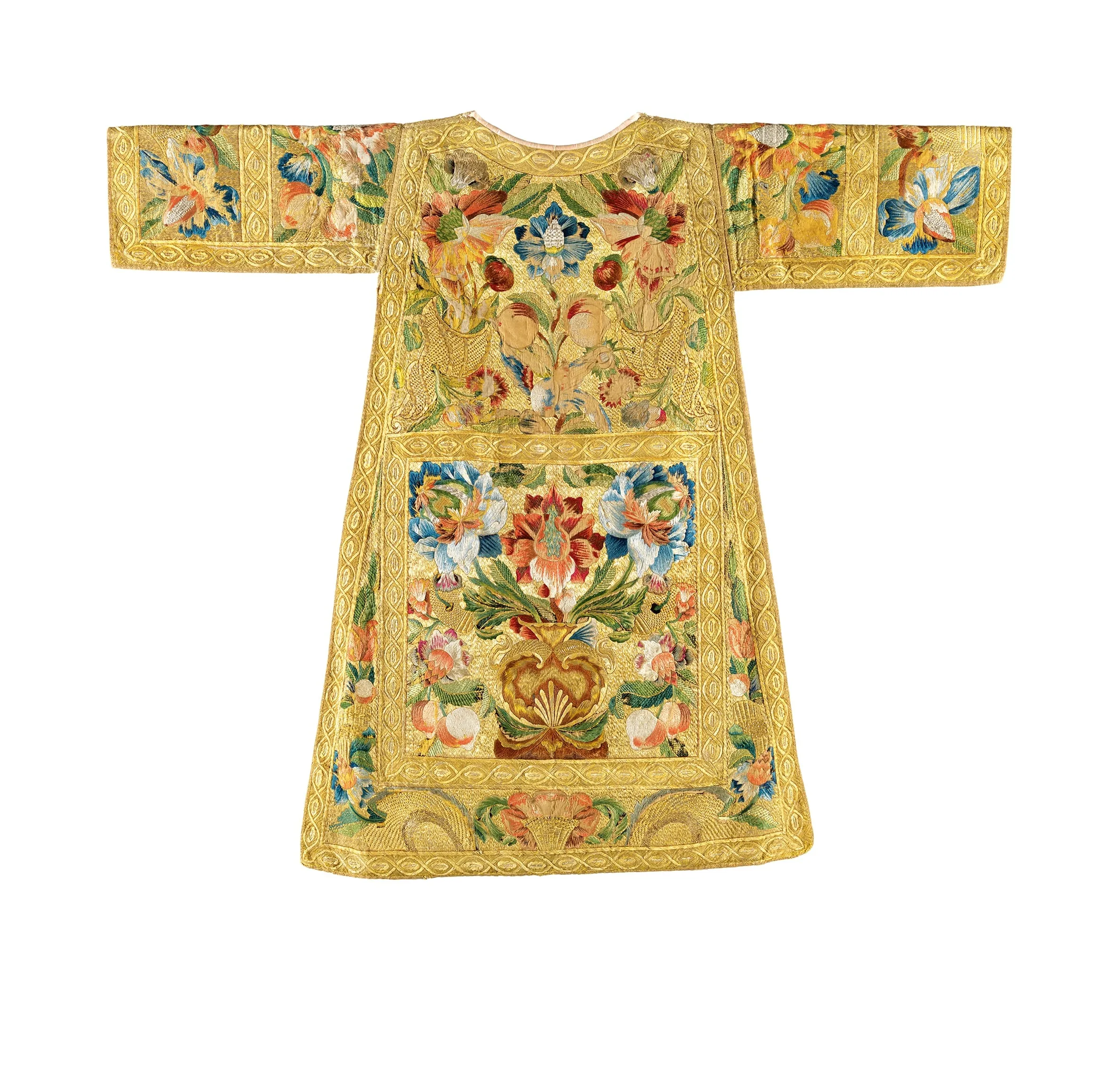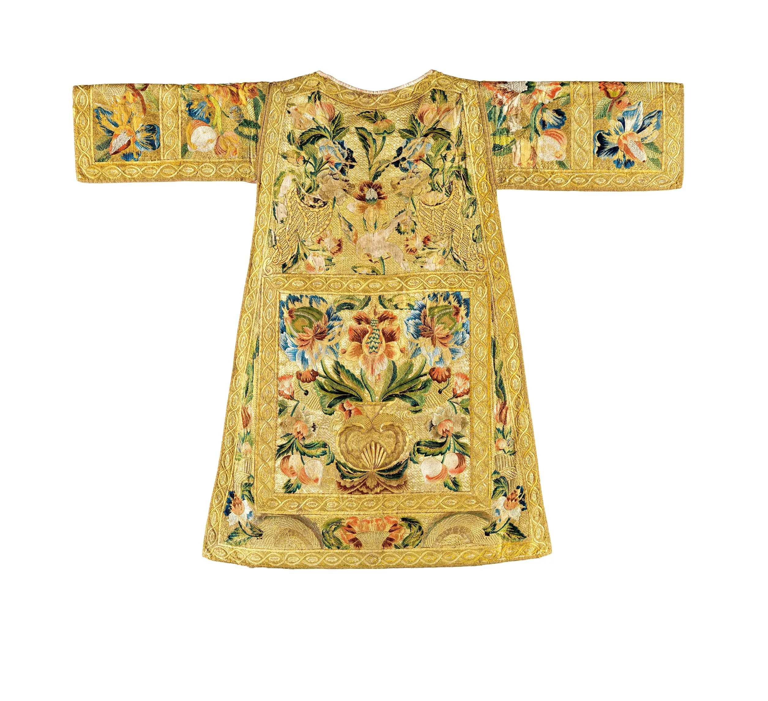 Embroidered for the church, vestments were among the most resplendent art forms of eighteenth-century Mexico. Meant to imbue Christ’s vicars with special meaning, these garments were created as sets in guild workshops led by master craftsmen, as well as by nuns in conventual settings. The quality of the embroidery, alongside the abundant use of silk and gold, reveals the enormous resources invested in their production. Constructed with an aesthetic and design program that came from Europe, and employing silk and gold and silver threads imported from China and Spain, these elaborate religious vestments embody the intersection of cultures made possible by global trade networks.