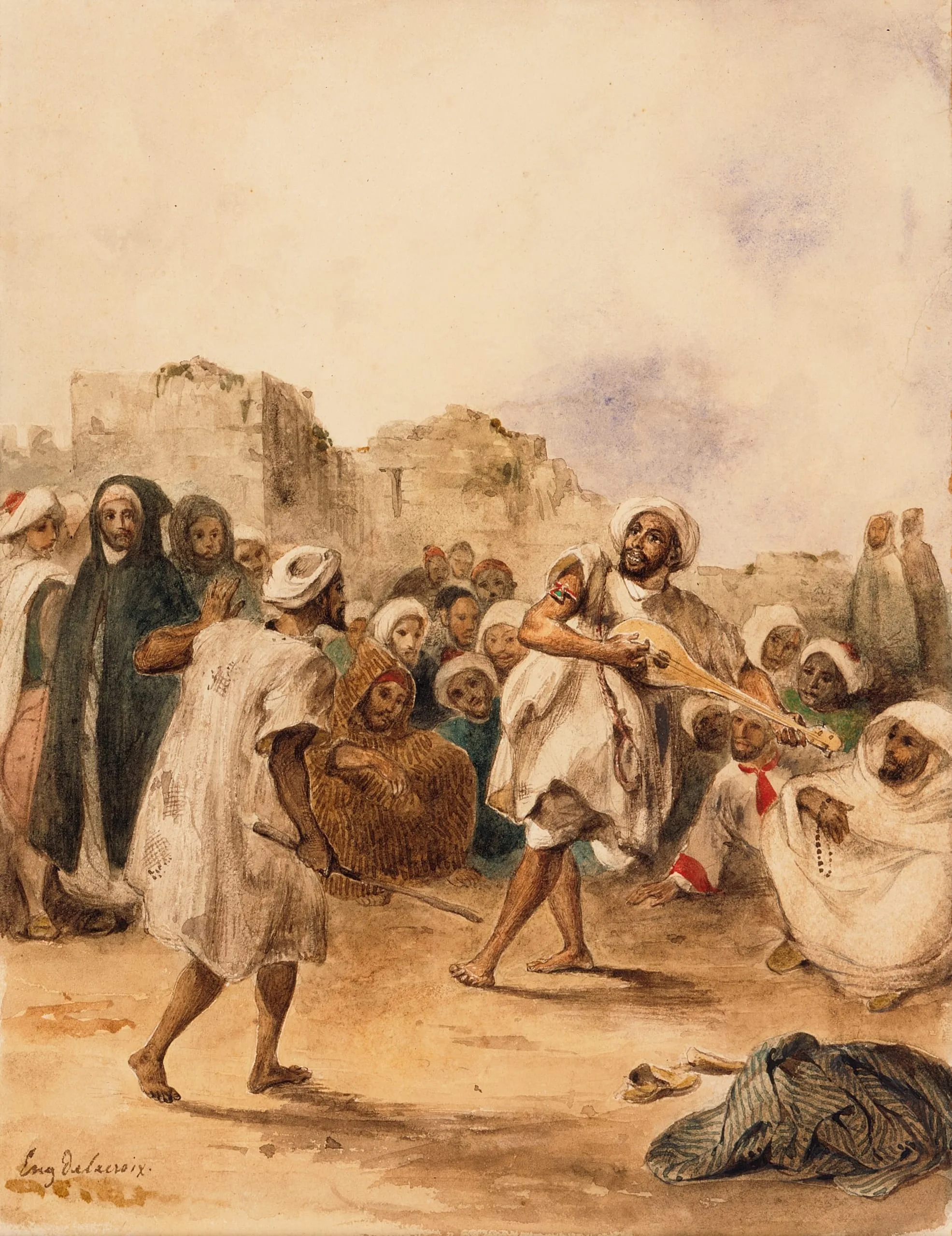 Delacroix painted this watercolor upon his return to France, while temporarily detained in quarantine because of a cholera outbreak. He produced an album of eighteen watercolors as a memento of the expedition for de Mornay, of which this work is one. This scene of strolling players captures both the immediacy and exoticism of Morocco's customs.