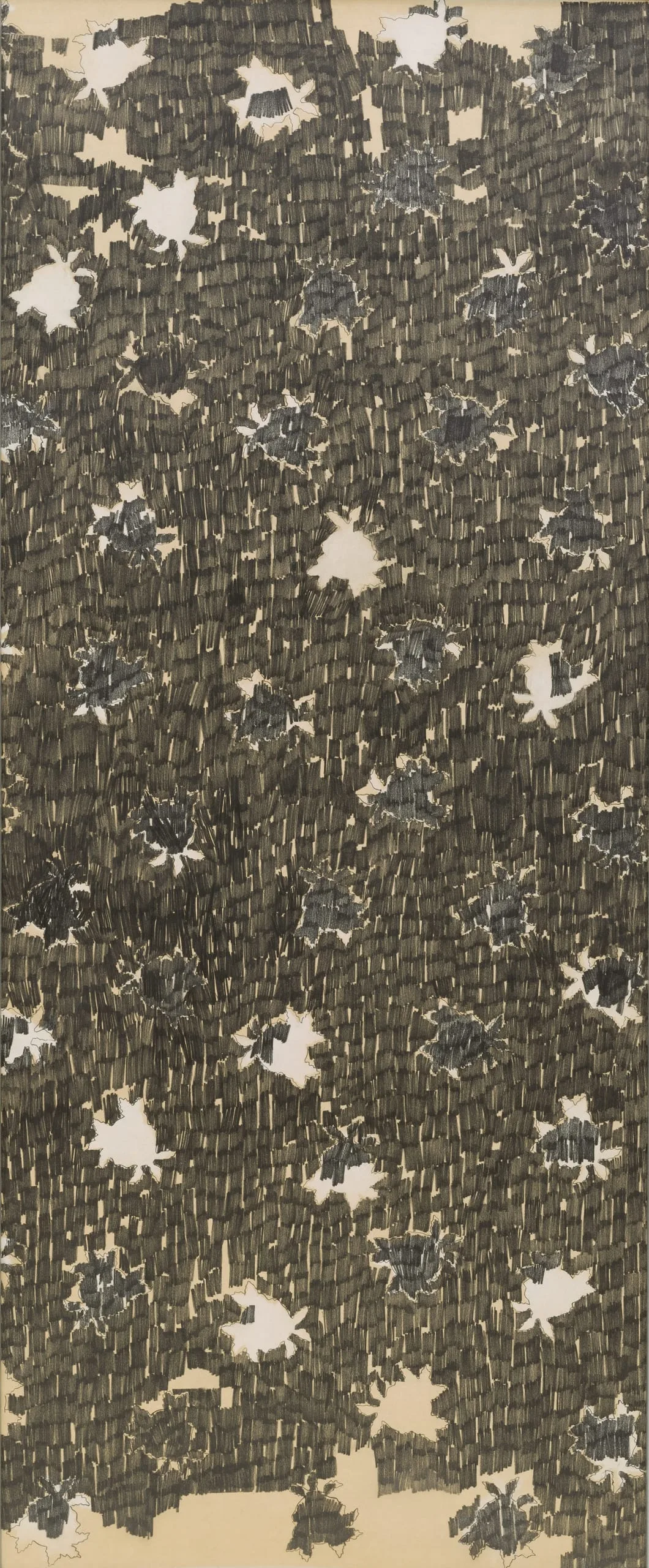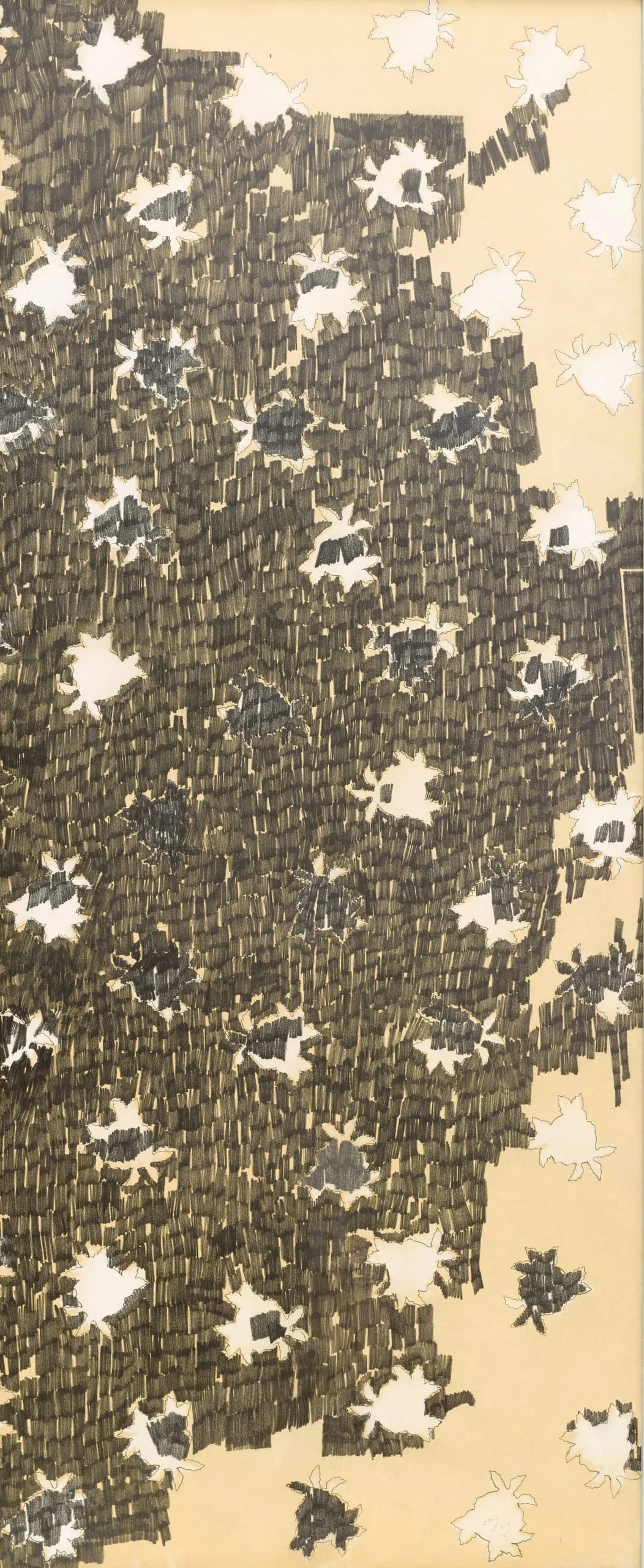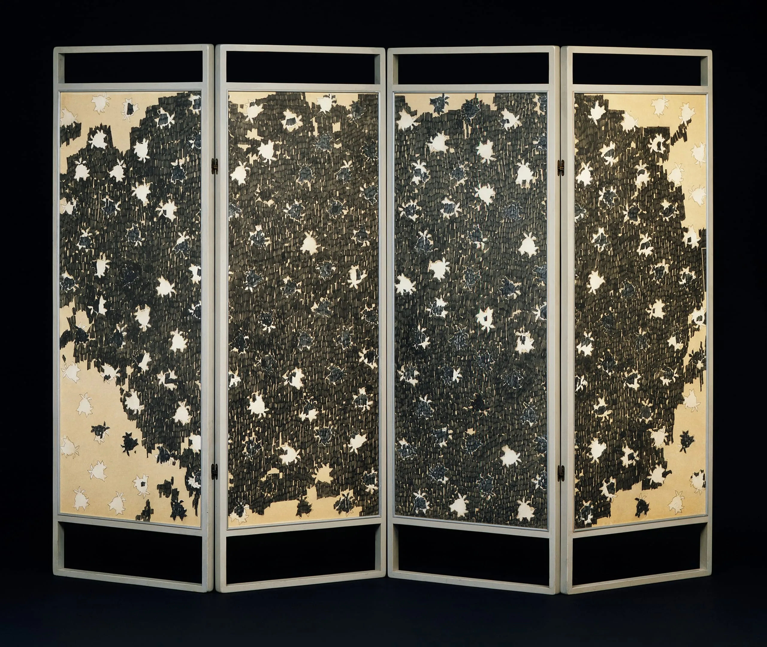- Graphite with painted wood frame and silver strip borders with panels connected by metal hinges