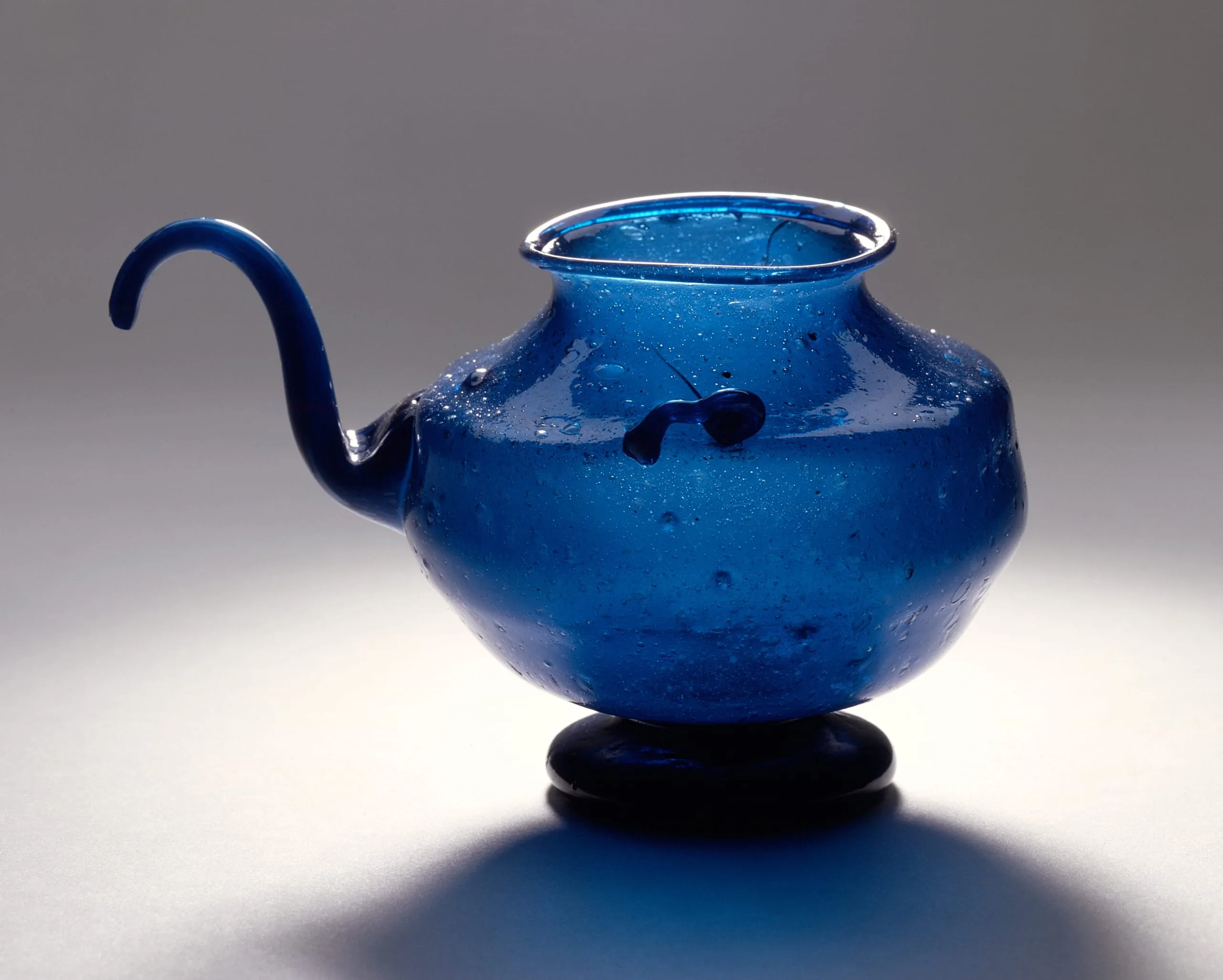 Made of blue glass, this urn is shaped like a lota with a spherical lower body, slightly tapering side walls, and concave shoulders leading to a wide mouth with an everted rim. It rests on a low pedestal foot and has a curved S-shaped spout. A decorative solid ribbon of glass rises from the shoulder.