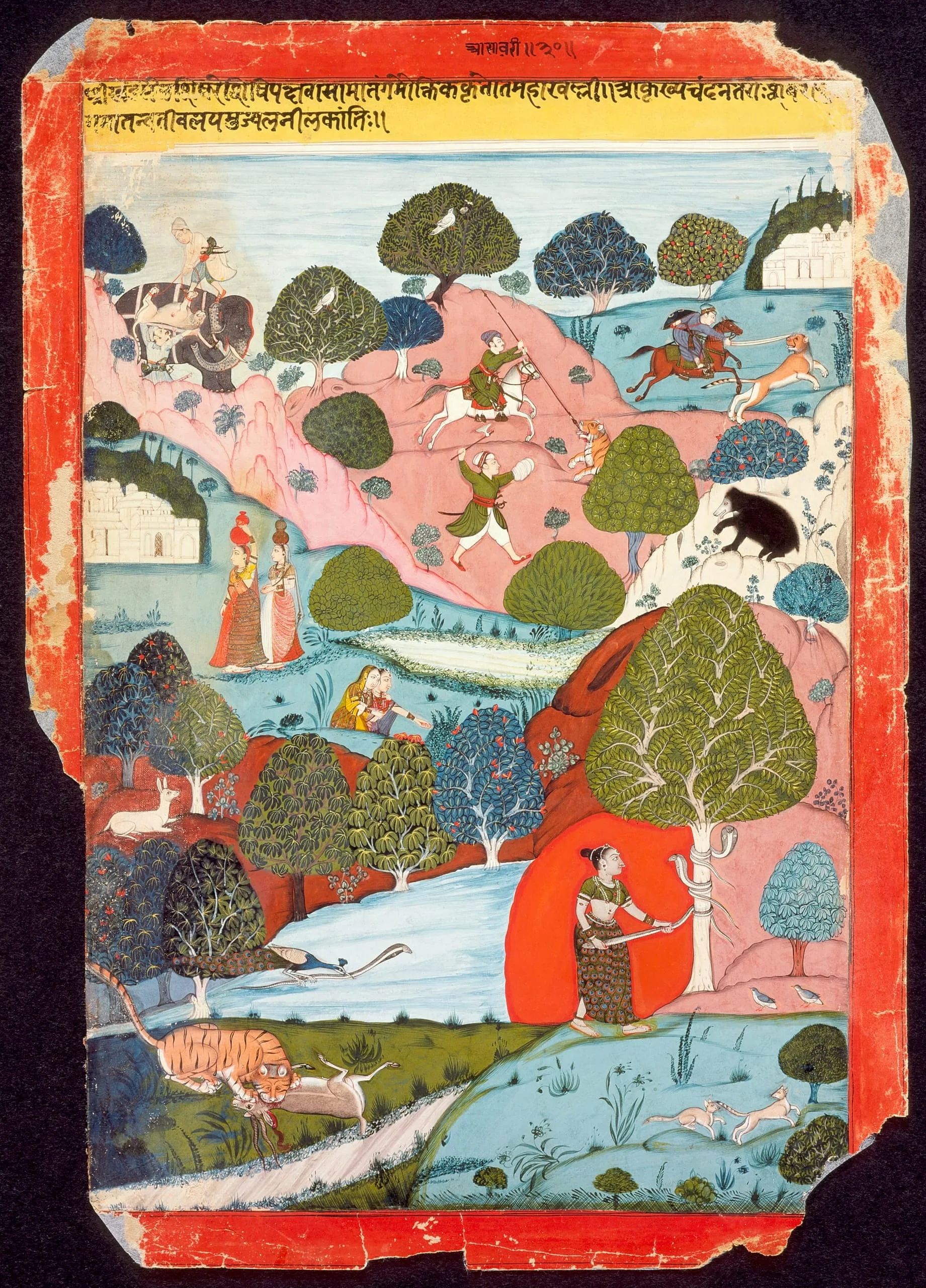 Here, she wears a peacock feather skirt and copious jewelry. She is pulling on a cobra wrapped around a tree trunk. The setting is a dense landscape with animal-hunting and genre scenes. See also AC1999.127.28–.30. Another folio from this dispersed series was formerly in the Sri Motichand Khajanchi Collection.