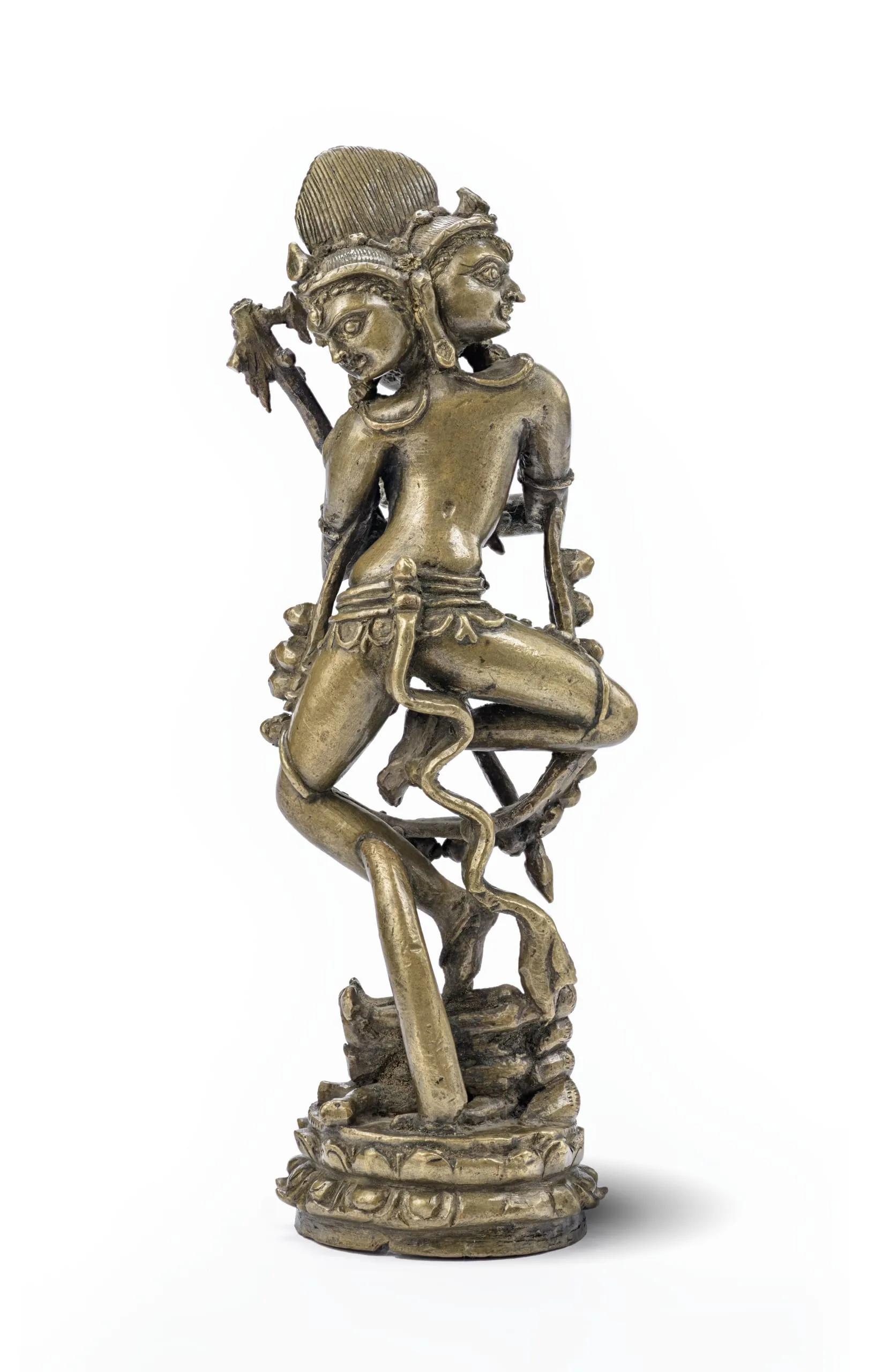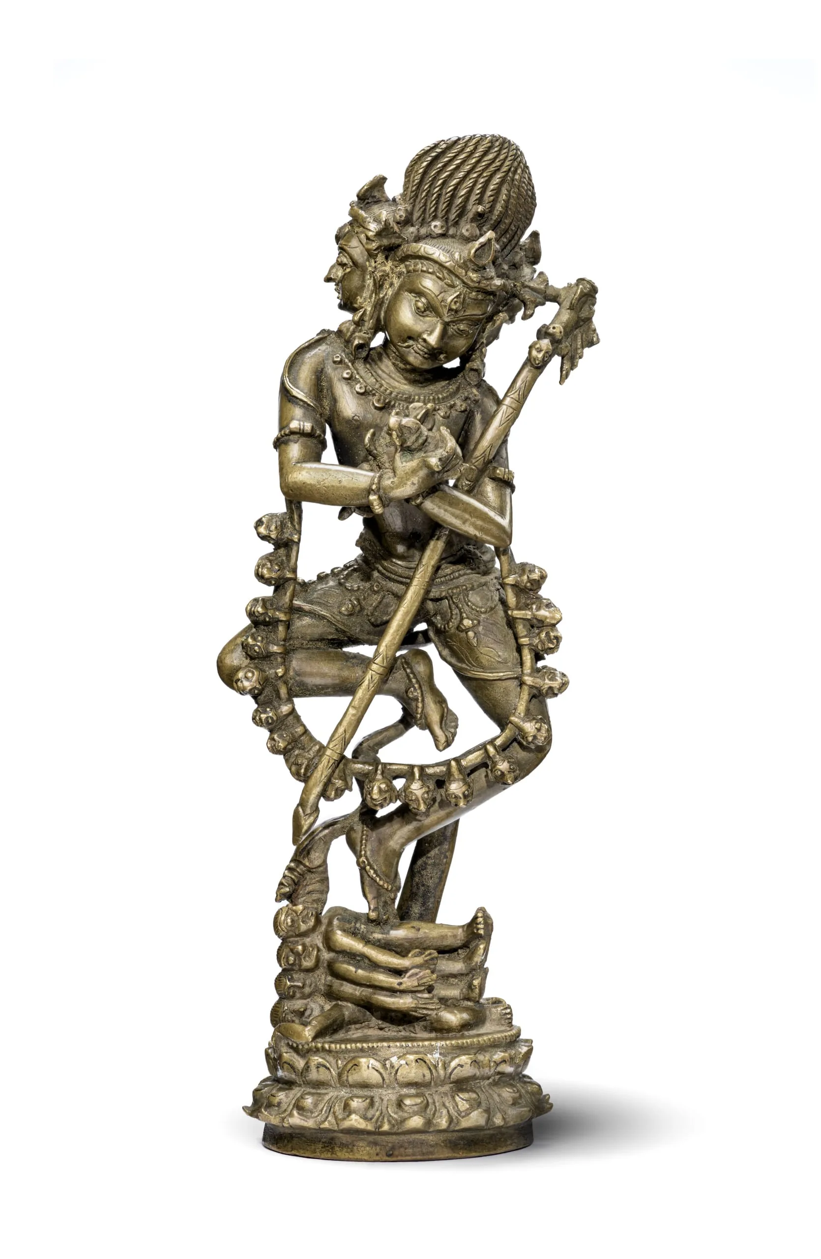 Hevajra has three heads, flaming hair, a prominent third eye, and two arms. He holds a thunderbolt (vajra) and vajra-topped bell (ghanta) in his hands, which are crossed in front of his chest in the thunderbolt-sound gesture (vajra humkara mudra) symbolic of his non-dual union with his female aspect, Nairatmya. A ritual staff (khatvanga) rests on his left shoulder. He wears plentiful jewelry, including a long garland of severed skulls. He is portrayed in the "half cross-legged" dance posture (ardhaparyanka-nritya), symbolic of a joyous and passionate Buddha nature. He is trampling on the four Maras, figures that represent various human failings, defilements, and death. See also M.81.6.