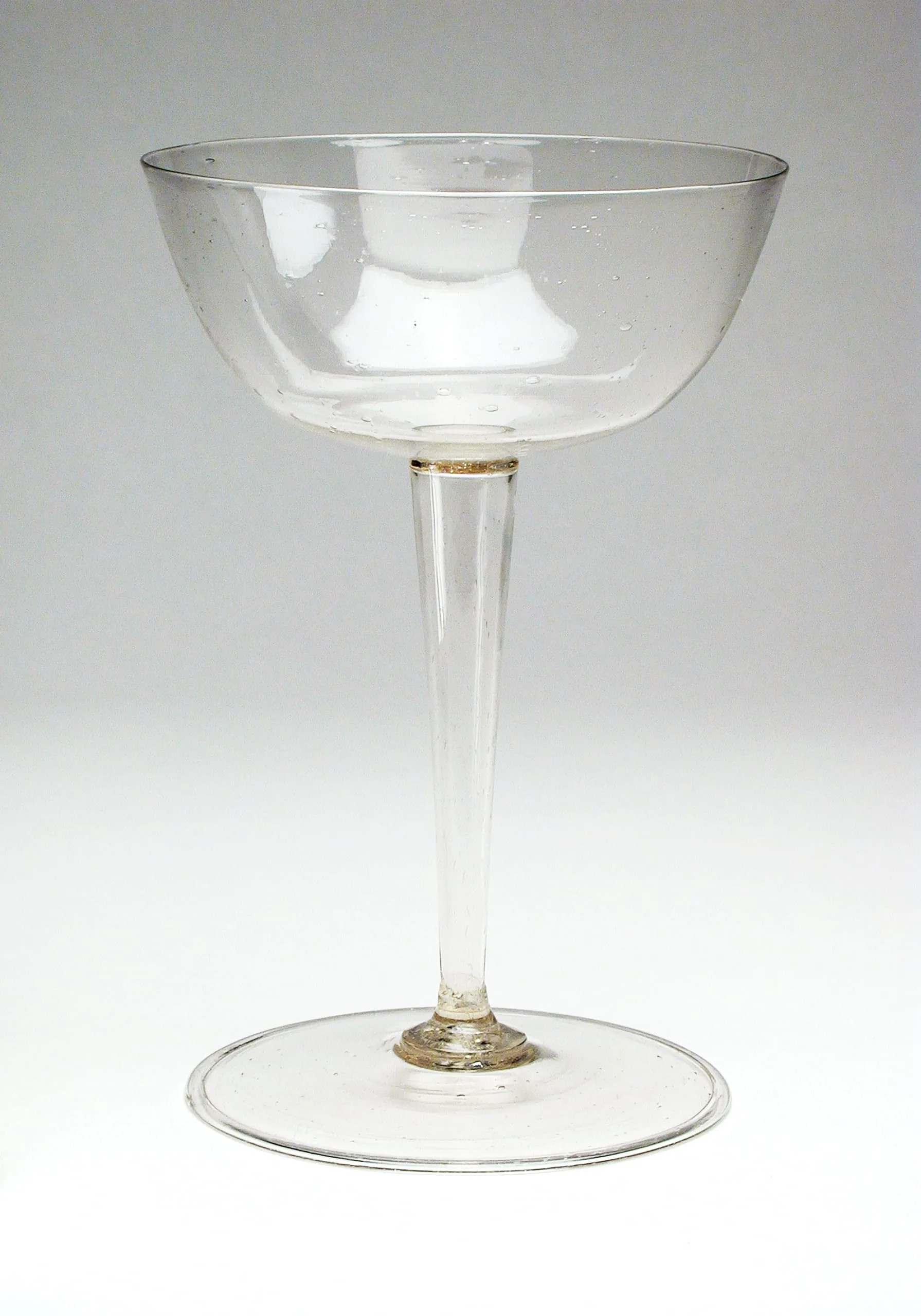 Blown glass stemware with a wide shallow bowl, long cylindrical stem, and flat circular foot, nearly colorless with faint warm tint and scattered air bubbles