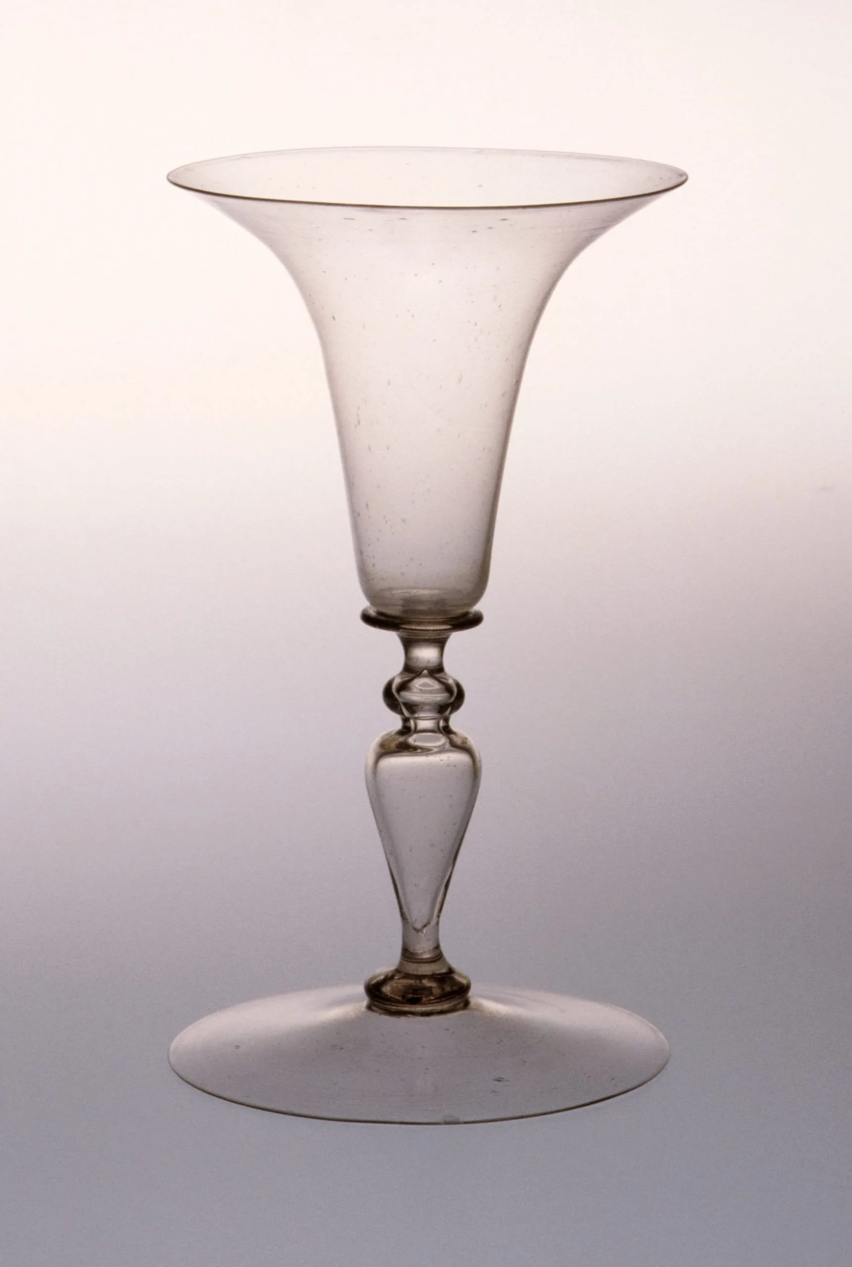 Blown glass vessel with a wide trumpet-shaped bowl, stacked knop stem, and flat circular foot, nearly colorless with faint smoky tint and scattered air bubbles