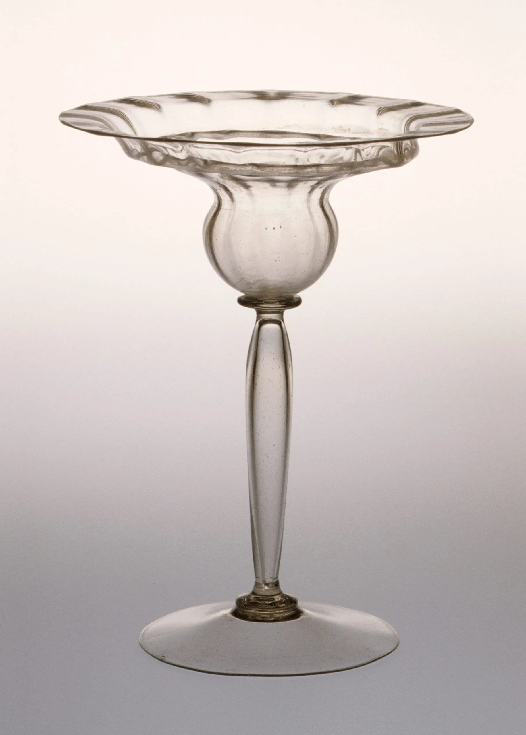 Tall blown glass tazza or compote with a wide scalloped bowl, bulbous knop, slender stem, and flat circular foot, in clear glass with a slight smoky tint