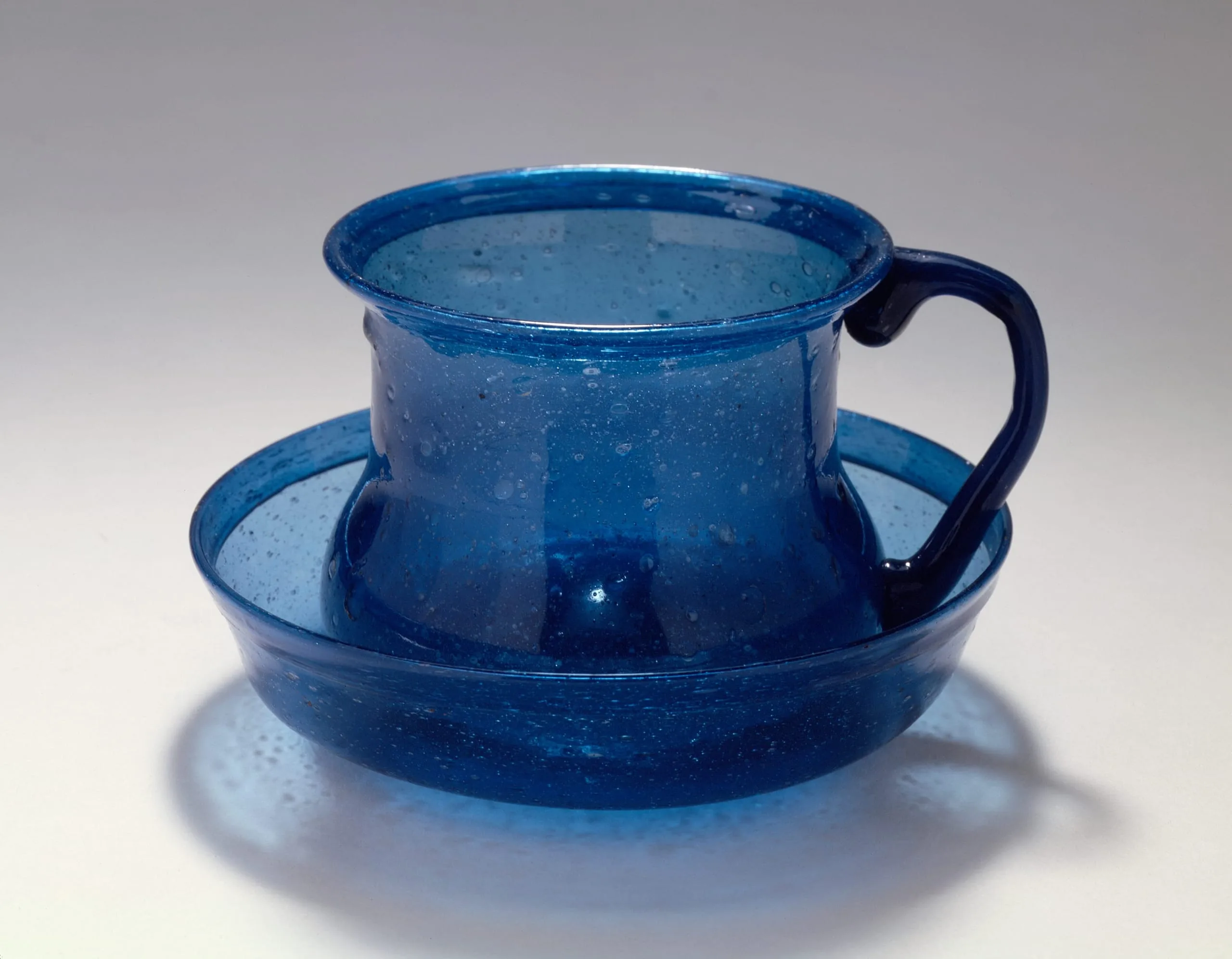 This blue glass teacup or coffee cup is modeled in morphological form on a lota (comparable to a compressed version of M.89.83.8). It has a spherical lower body, tapering shoulders, a tall vertical neck, and an everted rim. The ear-shaped loop handle is solid. It has a deep saucer with slightly concave side walls and a reinforced rim. Tea and coffee were introduced into Europe and their colonies by the mid-17th century.