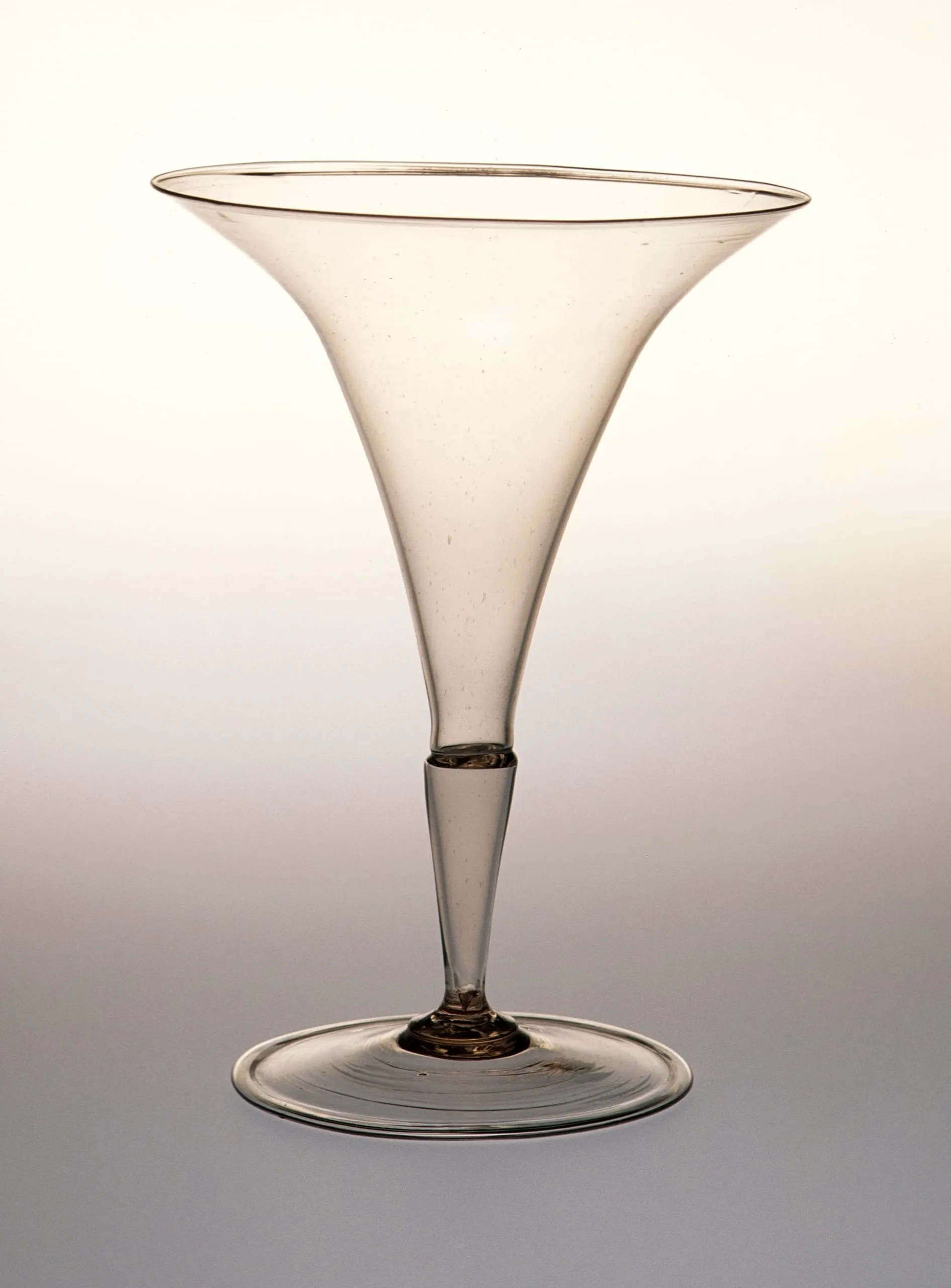 Blown-glass trumpet-shaped drinking vessel with wide flaring bowl, slender stem with amber-tinted knop, and flat circular foot