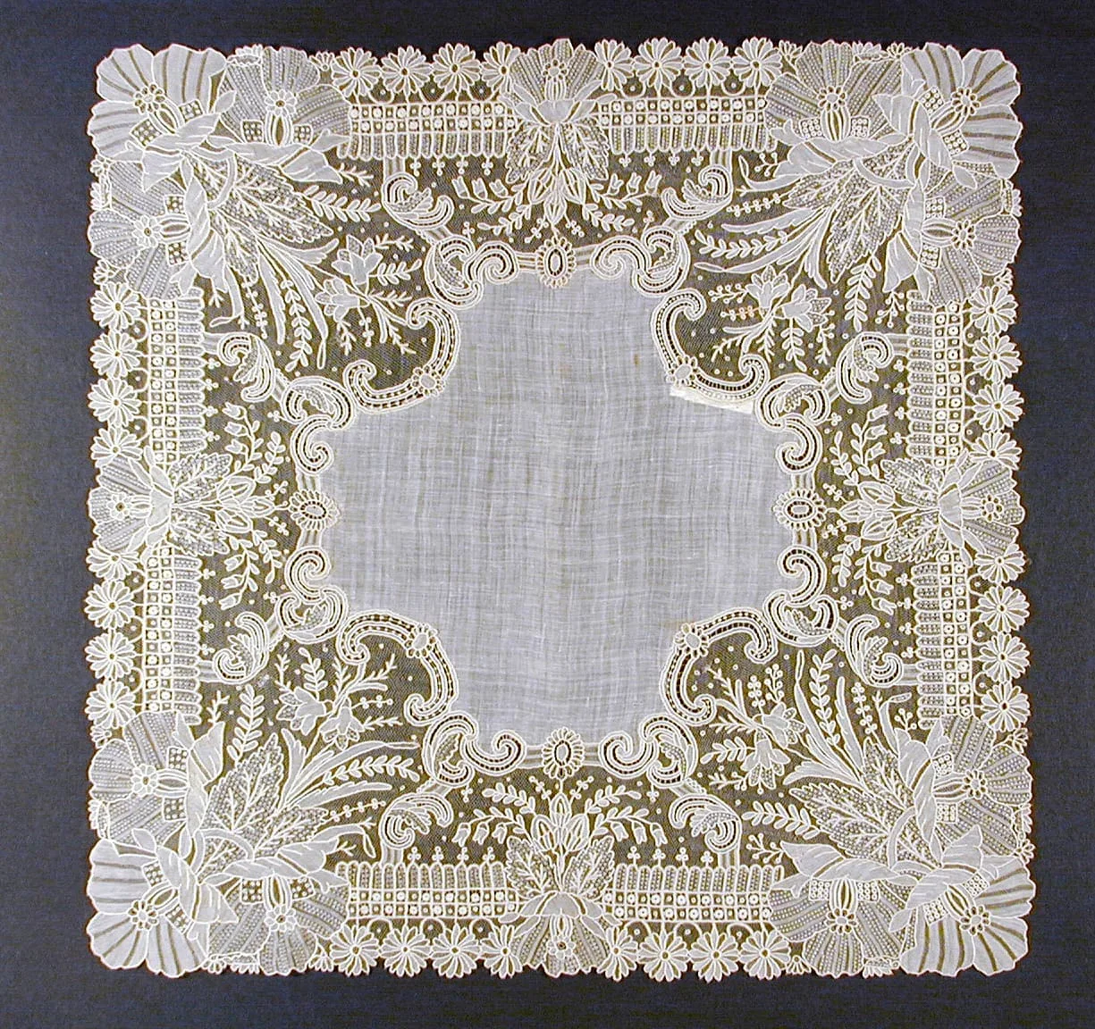 Needle lace handkerchief with ivory-white scrolling floral border surrounding a plain linen center, scalloped edges, viewed from above